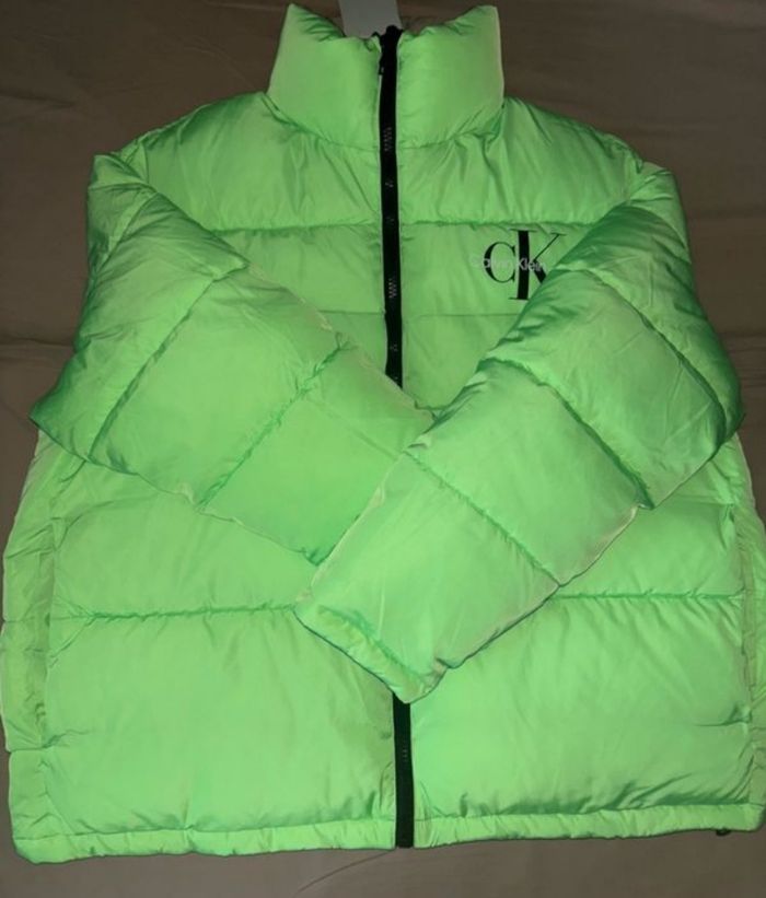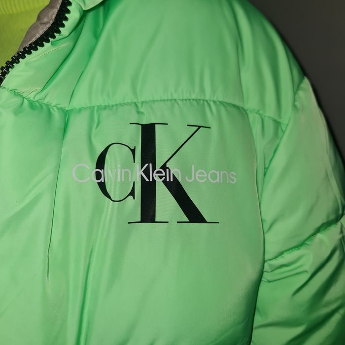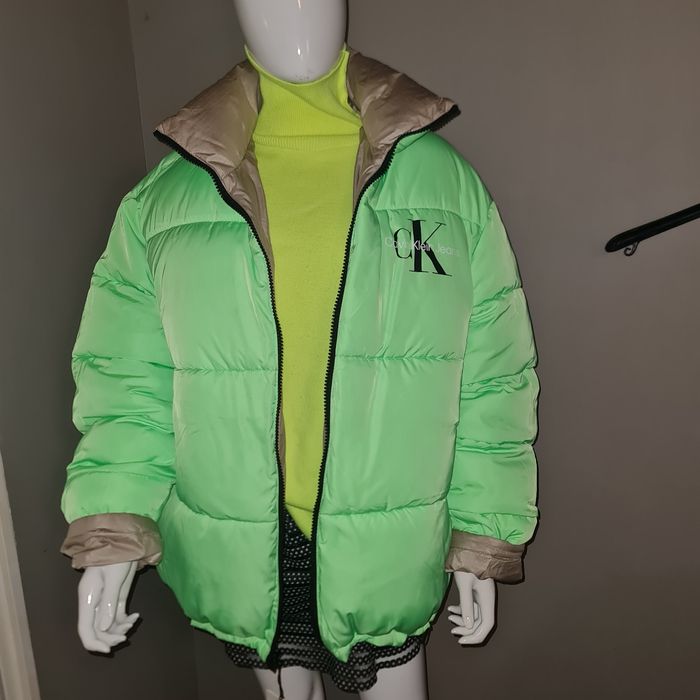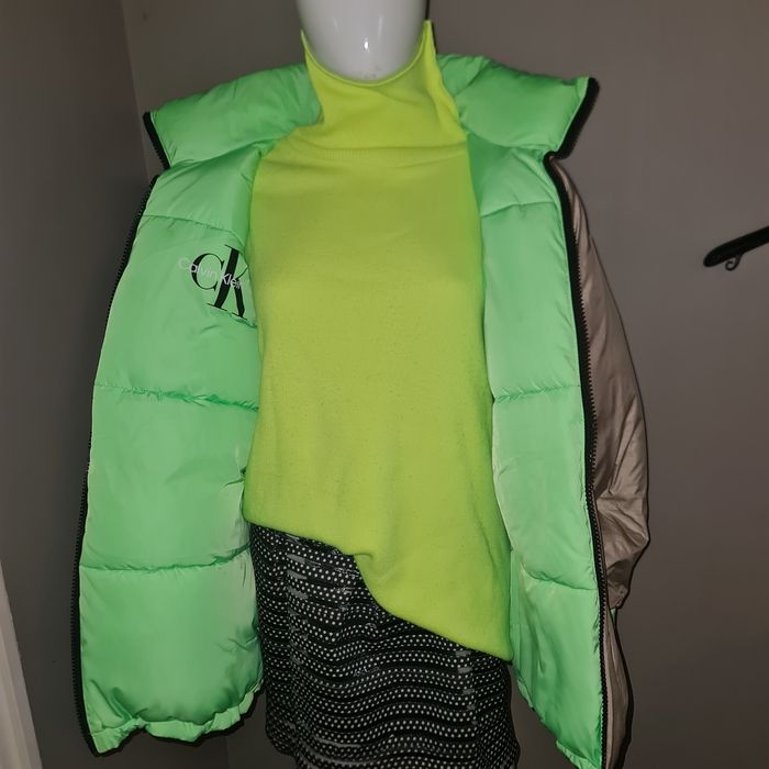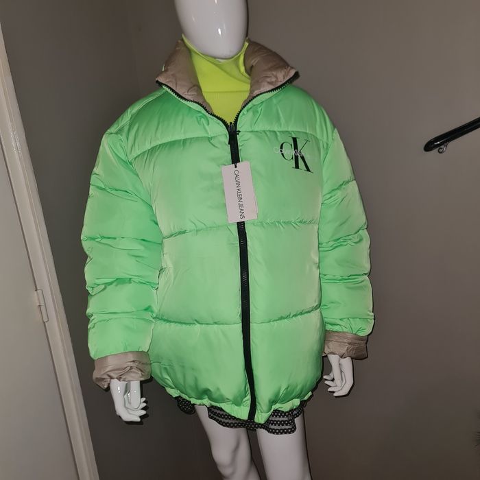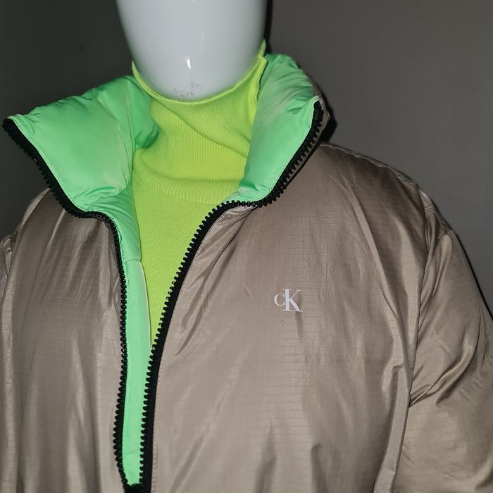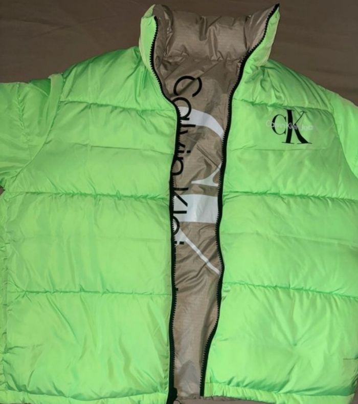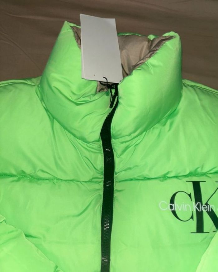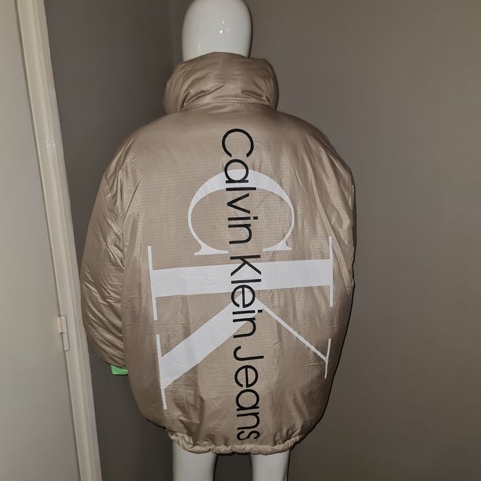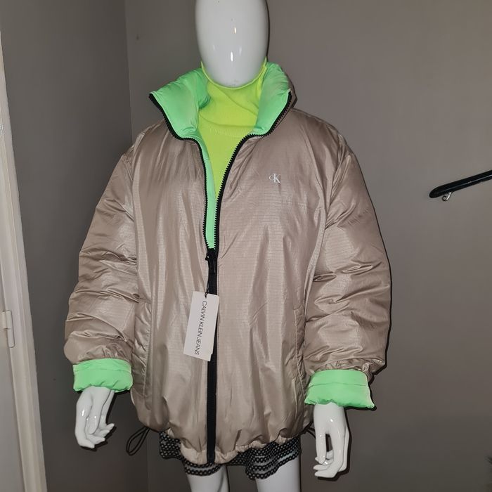 Doudoune Calvin Klein Reversible bicolore. Neuve avec étiquette en taille M. Tissu imperméable. Ample. Ourlet avec cordon de sérage élastique. Fermeture zippée. Poches de chaque côté se fermant par pression. Calvin Klein imprimé sur la poitrine et en grand dans le dos. Prix d'achat 149,94€