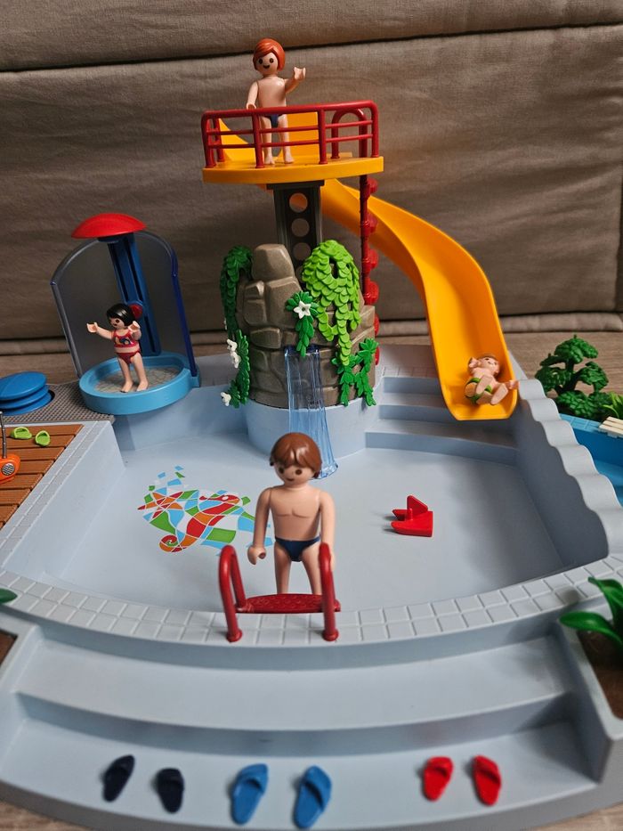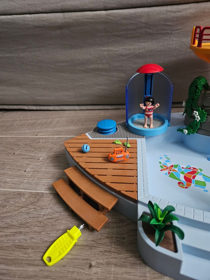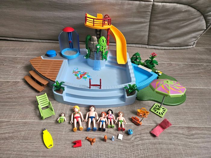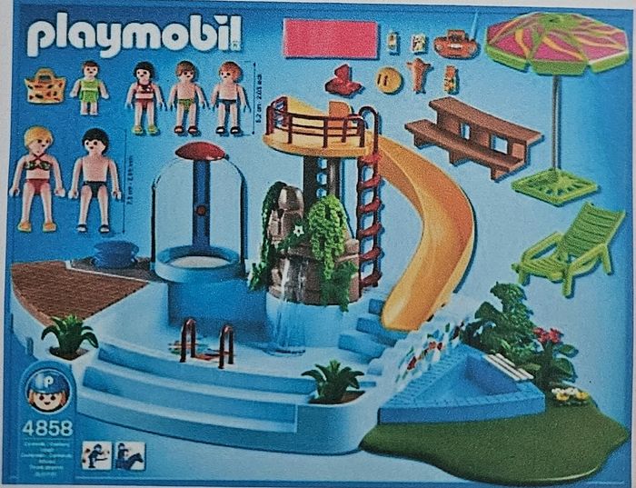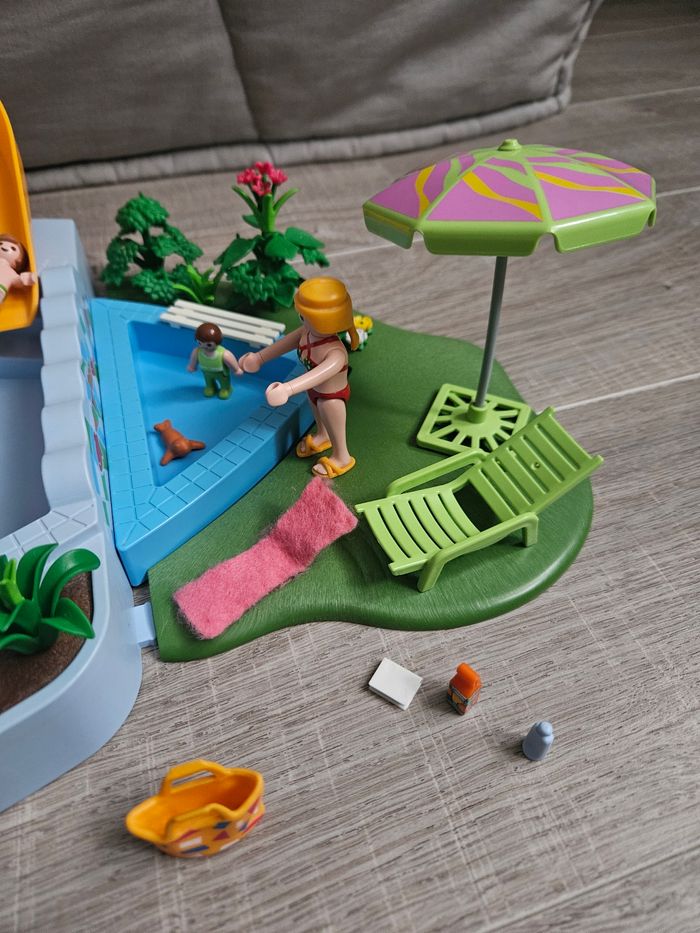 Toute la famille profite de la piscine ! Avec six personnages, une piscine avec plusieurs éléments (toboggan, douche, échelles) et de nombreux accessoires (tongs, serviette, jouets…). Comprend une pataugeoire pour les tout-petits, une chaise longue et un parasol. Complet sans boîte. Très bon état
