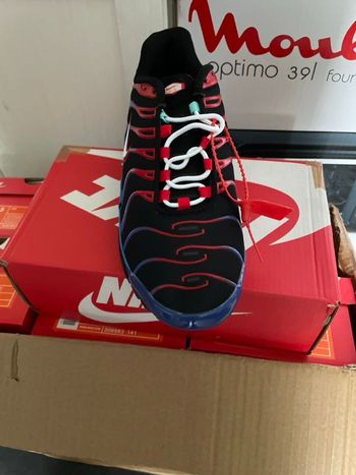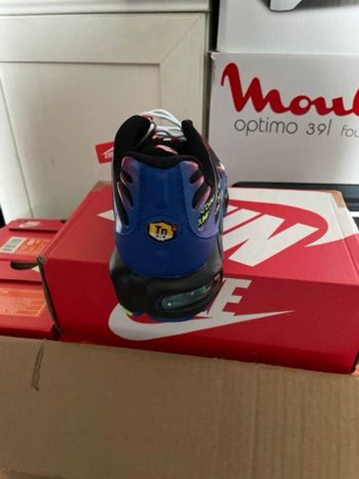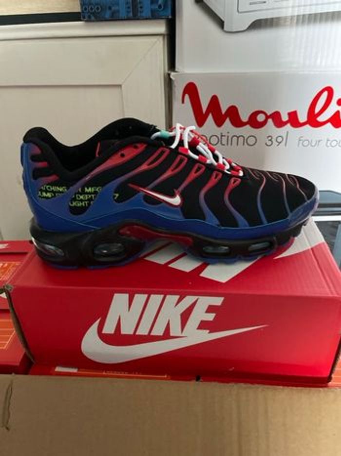 Bonjour ou bonsoir, je vends des TN couleur rayures bleue, tissu noir et un peu de rouge pointure 43 full qualité très très très bonne qualité
