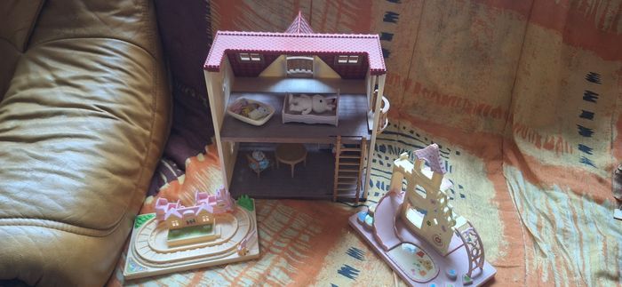Je vend la maison avec 1 lit, 1 table, 1 chaise, une cuisinière. Il y a également une station de train, 1 petit château de jeu ainsi que quelques figurines. Tout est en très bon état.