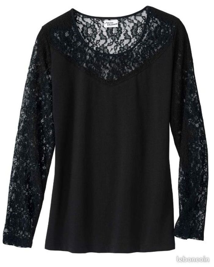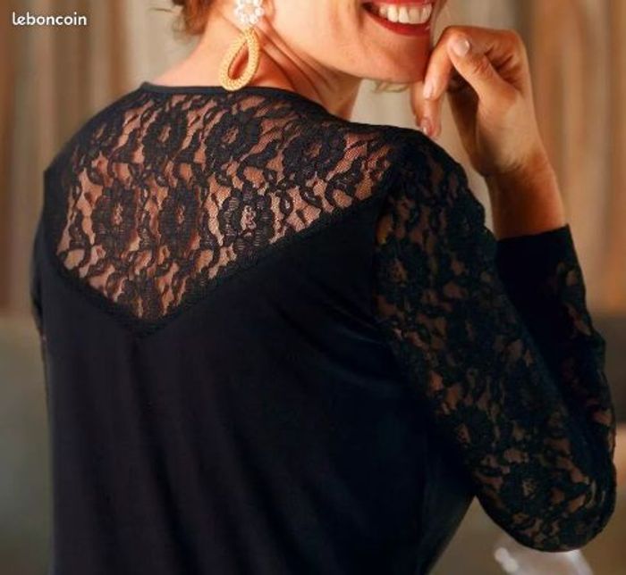 Tunique Dentelle et Coton : Sortez le grand jeu avec cette tunique noire habillée de dentelle ! Coupé dans un doux coton (160 g/m² env.) au niveau du corps, ses manches longues et son décolleté sur le devant et au dos sont entièrement confectionnés dans une superbe dentelle noire ! Un petit haut ultra-chic et confortable, idéal pour les fêtes ! Encolure arrondie finition colletage. Bas droit finitions doubles surpiqûres. Jersey 100 % coton. Dentelle 66 % polyamide, 34 % viscose. Hauteur dos : 67 cm env. pour la taille 42/44. Lavage en machine à 30°.