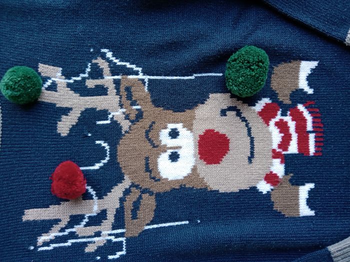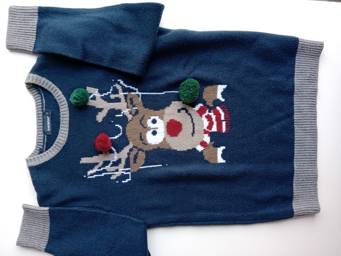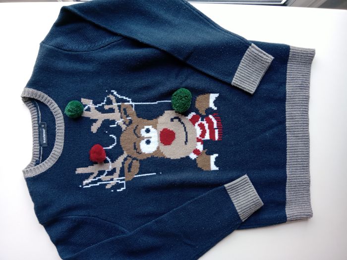 Magnifique pull bleu marine et gris, en très bon état, un renne avec ses pompons.