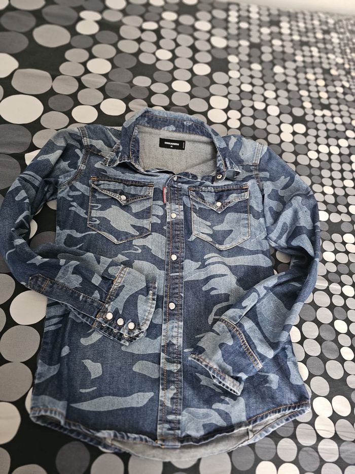 Chemise en jean DSQUARED2 authentique, motif camouflage bleu, style urbain et tendance. Denim de qualité premium, coupe ajustée, boutons pression, poches poitrine et finitions soignées. Pièce forte facile à porter, idéale pour un look casual chic ou streetwear. Article en très bon état. 🔹 Marque : DSQUARED2 🔹 Pour : Homme 🔹 Taille : 46 (équiv. S/M selon morphologie) 🔹 Matière : 100 % coton 🔹 Fabrication : Made in Italy Mesures à plat : - Aisselle à aisselle : 48 cm - Longueur (haut/bas) : 63 cm