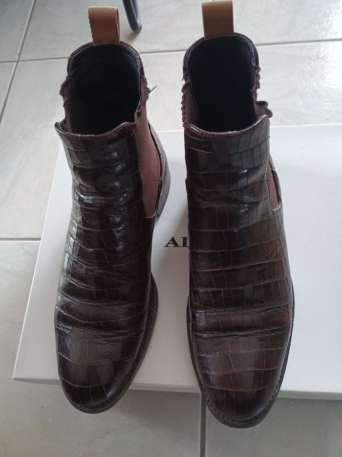 Bottines marron façon croco en cuir Semelle intérieure et extérieur cuir Marque d'usure au niveau des talons sinon ras Marque adige.