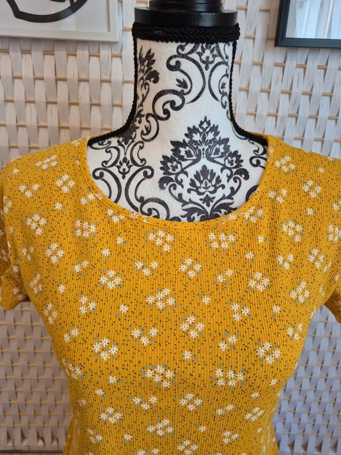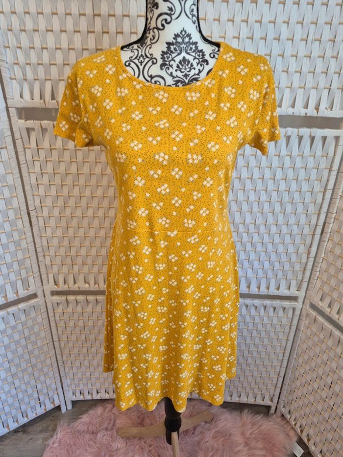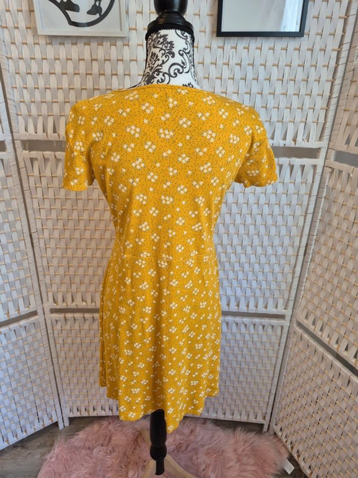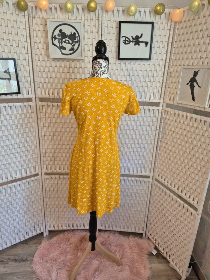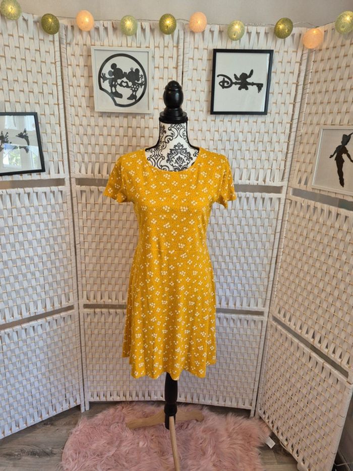* 🌼 Superbe petite robe d'été couleur jaune moutarde avec un adorable imprimé de petites fleurs blanches et bleues, dans un style très années 90.