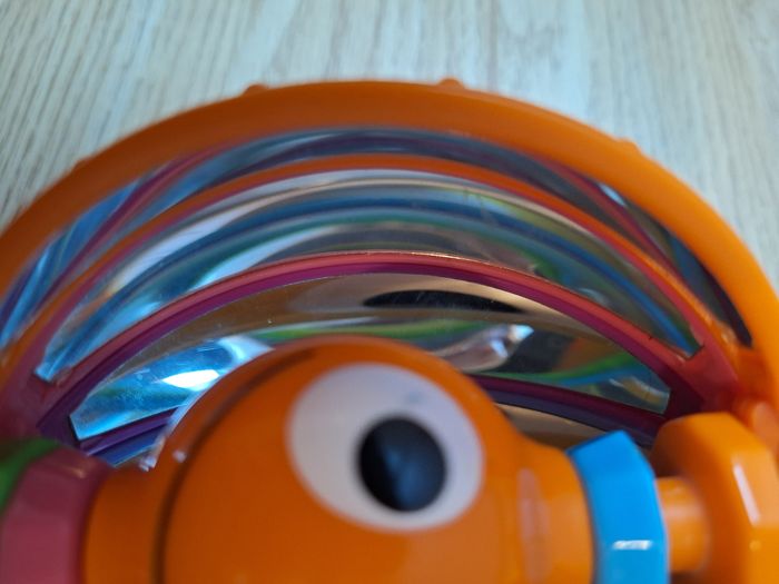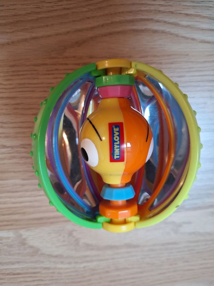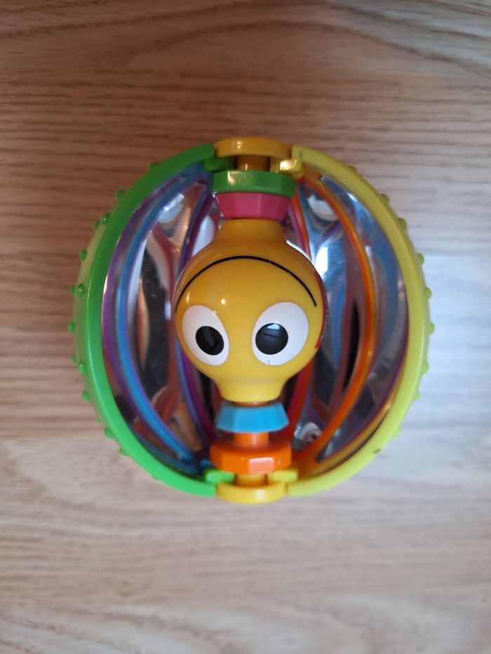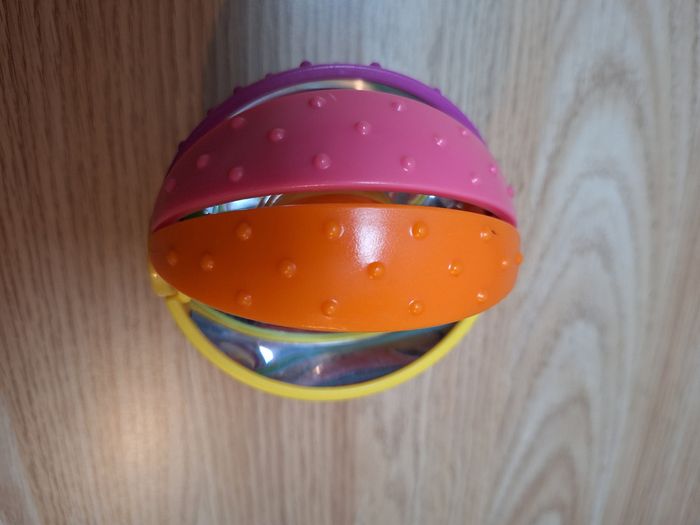 Petite balle facile à attraper pour les petites mains, solide, chaque petit quartier de la balle se déplace pour laisser apparaître les personnages souriants au milieu. Lorsque l'on regarde à l'intérieur il y a un effet "miroir". Dans le centre, se déplacent des petites billes pour un joli tintement lorsque bébé la secoue. Au toucher, les quartiers sont recouverts de petits picots qui permettent de mieux agripper la balle.