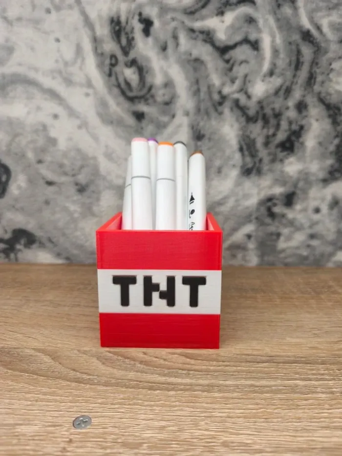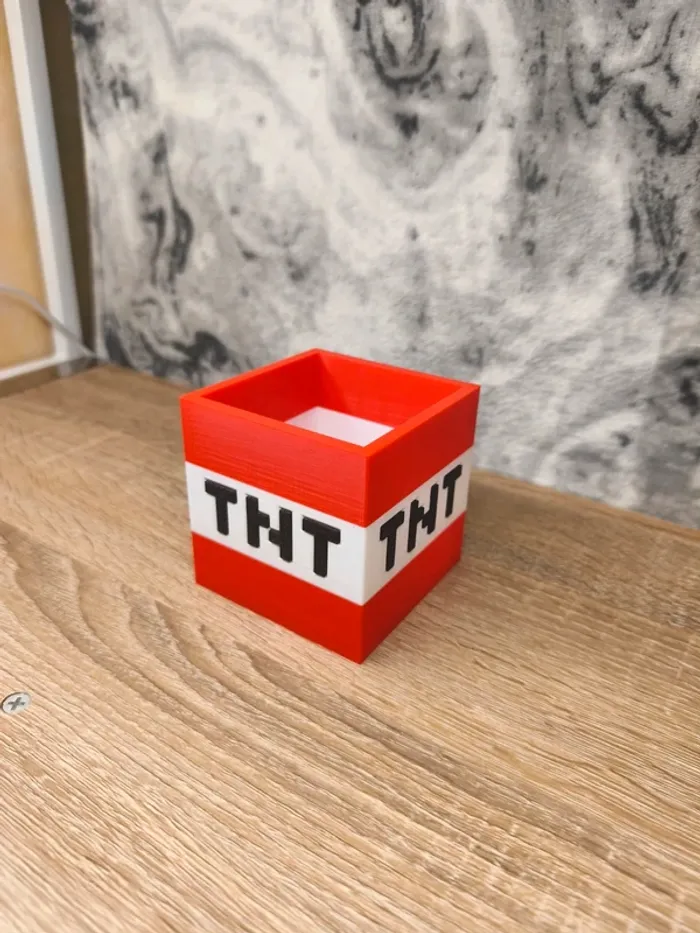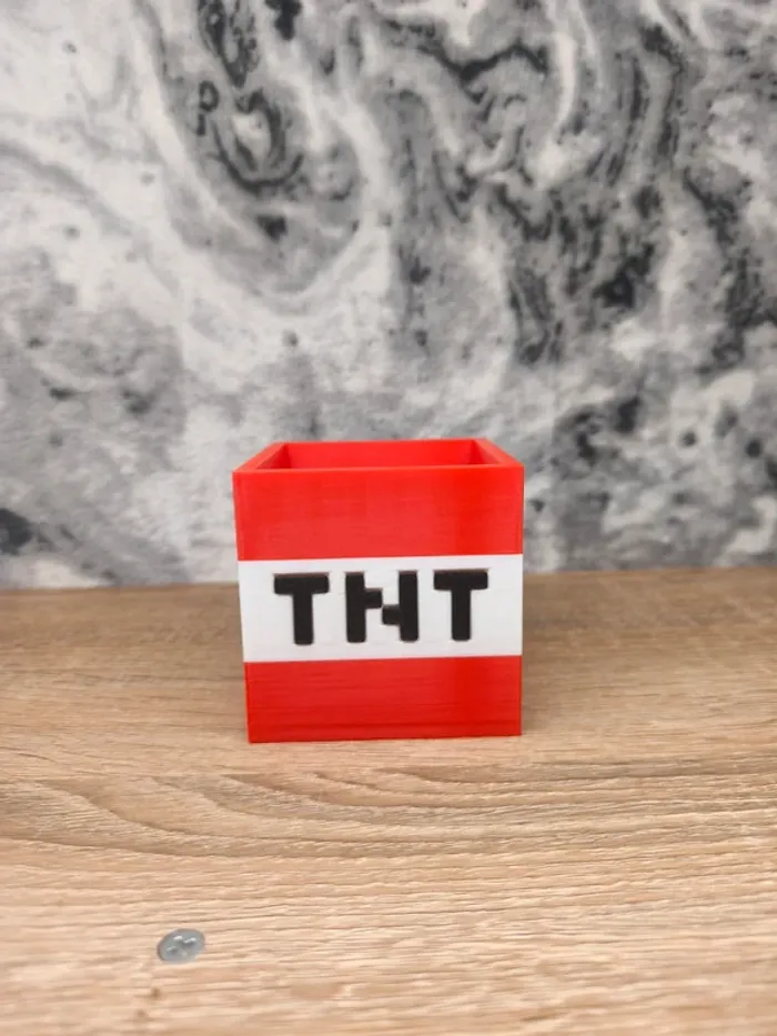 Ajoutez une touche de fun à votre bureau avec ce pot à crayons ou à rangement imprimé en 3D ! Avec son design en blocs inspiré de l'univers des jeux vidéo, il représente un bloc de TNT.
