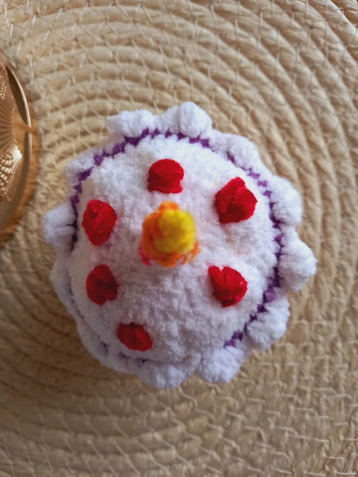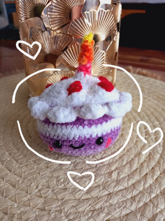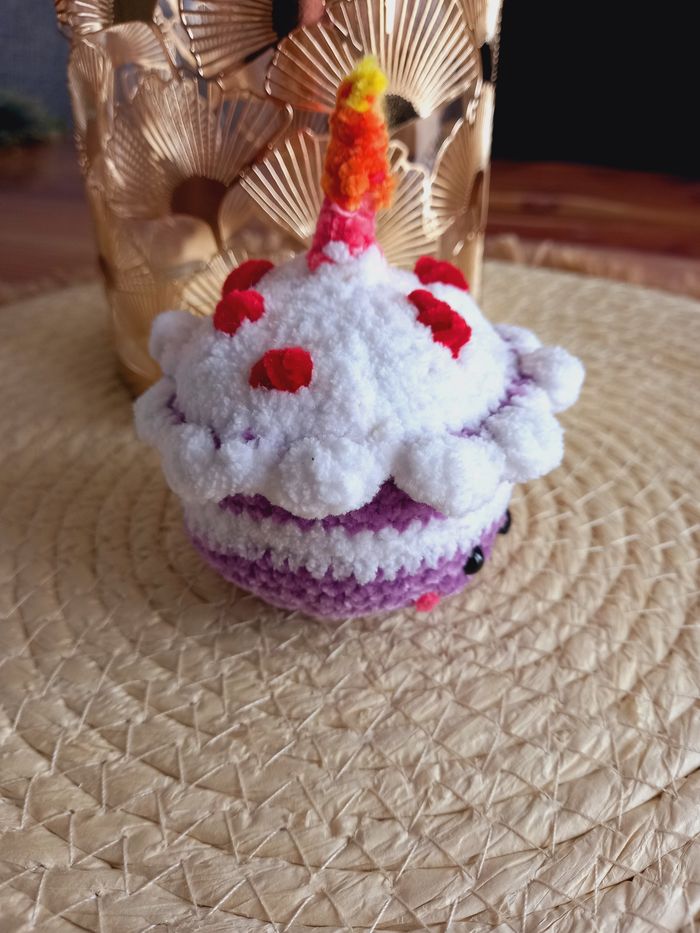 ici un birthday cake 🎂🍭 amigurumi kawaii couleur violet, blanc avec ses petites joues rose et sa bougie d'anniversaire ^-^
