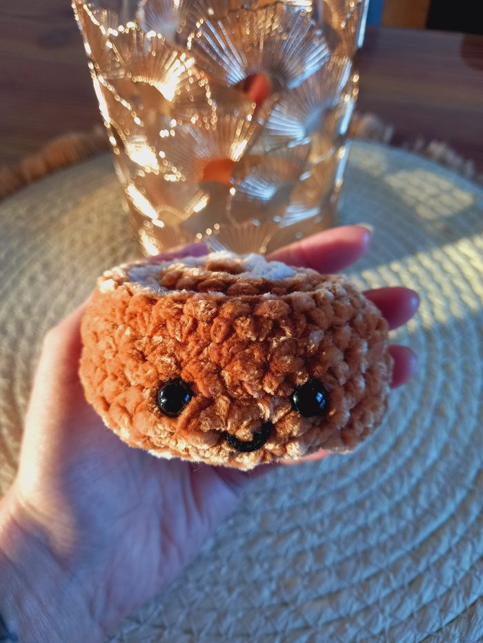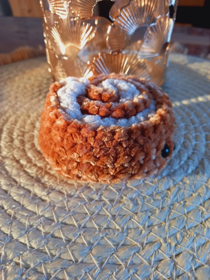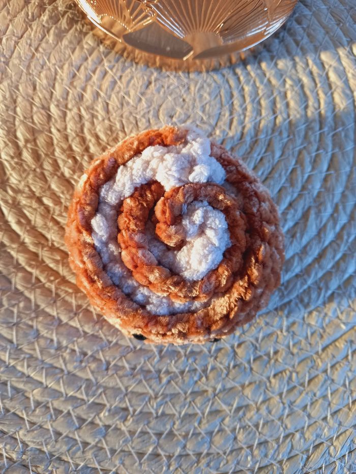 ici un cinnamon roll amigurumi kawaii 🥯 couleur beige et caramel ^-^