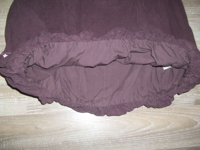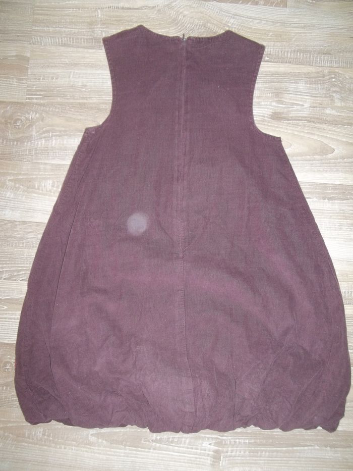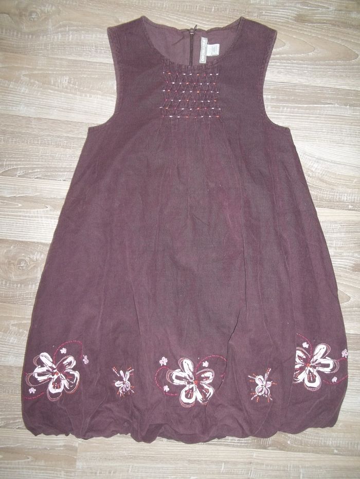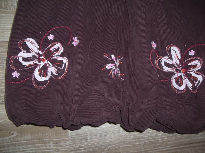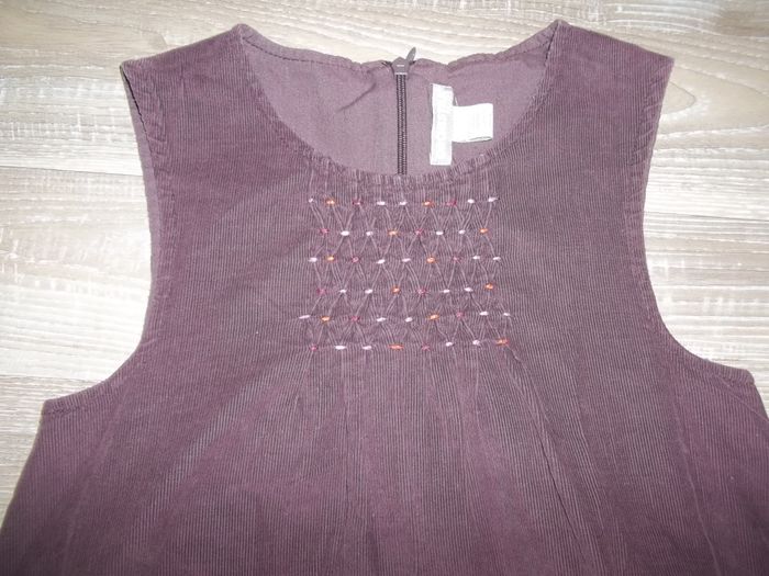 Robe chasuble sans manche, petit col rond, velours 100 % coton finement côtelé doublé (65 % coton 35 % coton), couleur entre marron, bordeaux et prune... smocks dans les tons roses et rouges sur plastron. Robe évasée avec élastique à la base, ouverture zippée dos (34 cm), broderies et sérigraphies fleurs sur le bas devant. Longueur env 66 cm, largeur aisselles 32 cm.