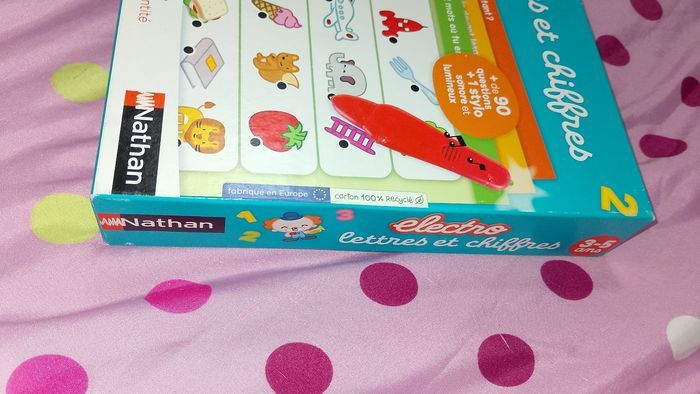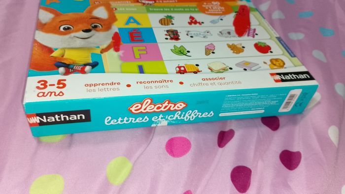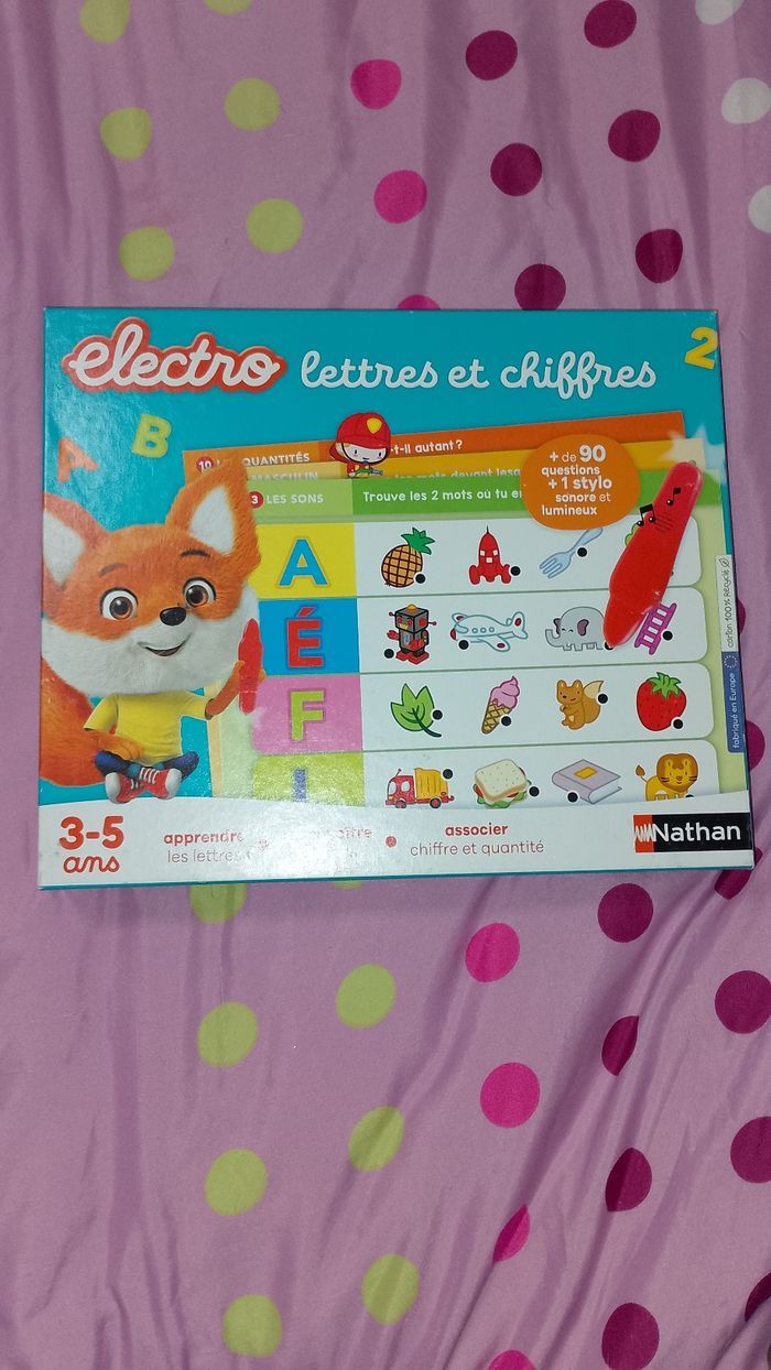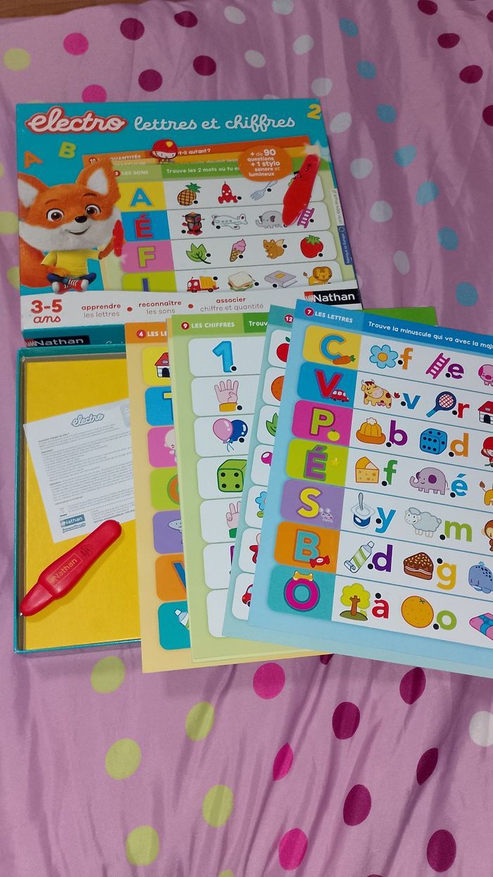 Electro lettres et chiffres Nathan 3-5ans Apprendre les lettres Reconnaître les sons Associer chiffre et quantité 6 grandes planches illustrées recto verso + 1 stylo avec signal sonore et lumineux En très bon état