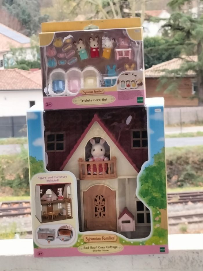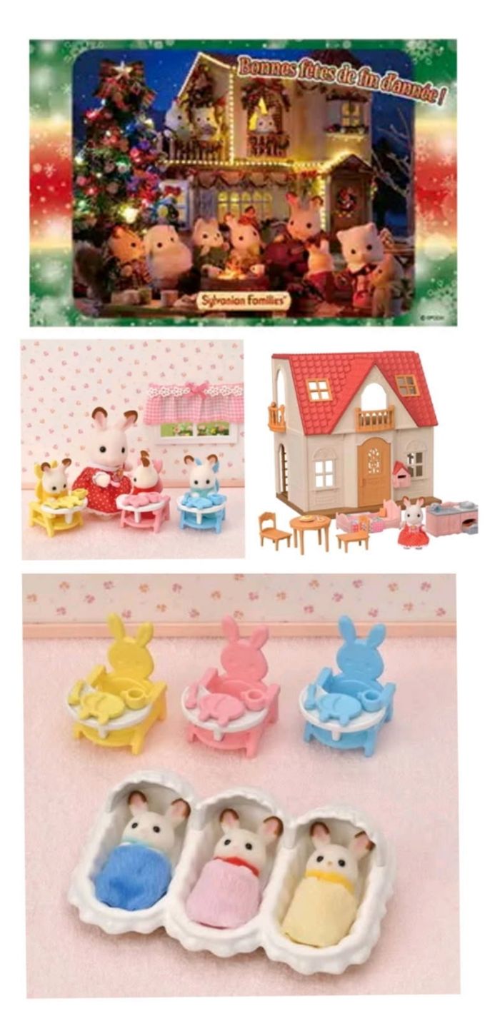 Une maison de poupée miniature, bien agencée , Freya, la fille Lapin Chocolat, les Triplés Lapin Chocolat et tout le nécessaire pour bien prendre soin d'eux.