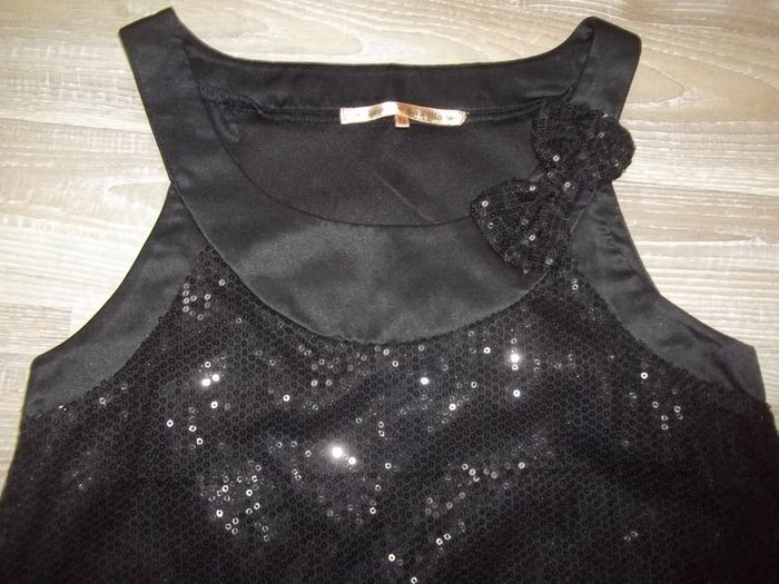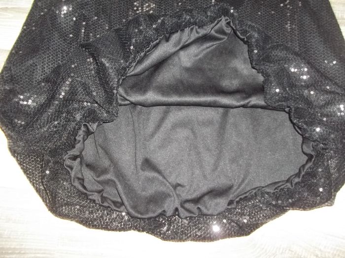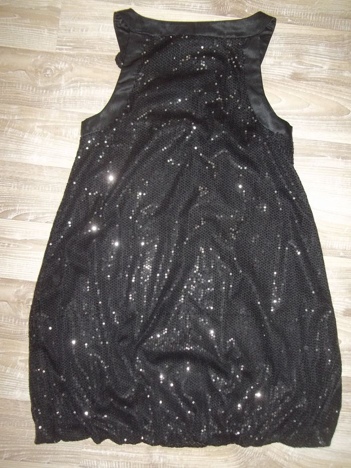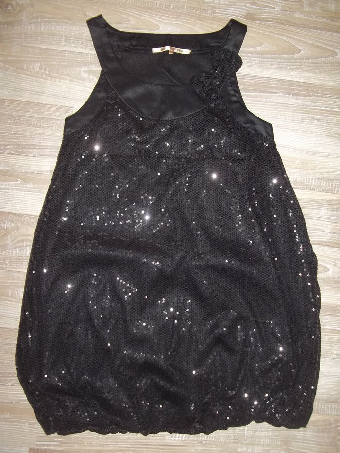 Robe chasuble large, élastiquée bas, 100 % polyester, tissu tull entièrement cousus de sequins (fixes), doublée, col et bord emmanchures en tissu uni satiné, noeud sur col du tissu en sequins, sans ouverture. Sans manche et même épaules plutôt bien dégagées. Notée 12 ans mais taille petit. Longueur env 72 cm, largeur aisselles 37 cm.