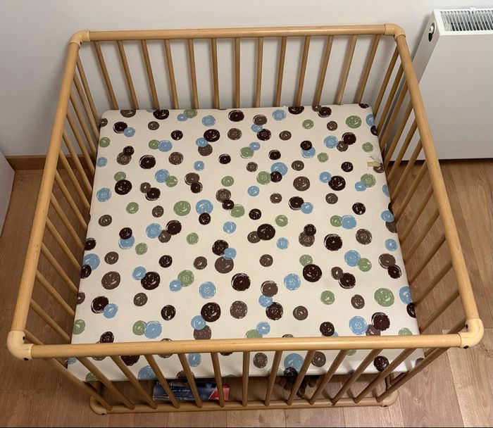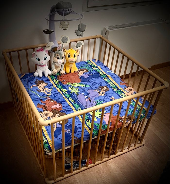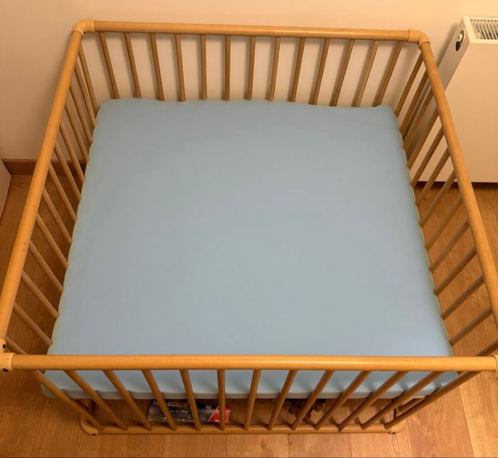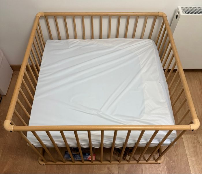 Vend parc pour bébé de marque Geuther avec un matelas en mousse épais d'environ 5cm, assez ferme pour que bébé se repose avec confort. Le parc a 3 niveaux différents en fonction de la motricité de bébé. Je donne un protège matelas aux dimensions du matelas pour le couvrir entièrement (dessus/dessous).