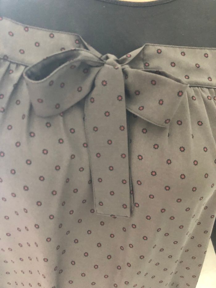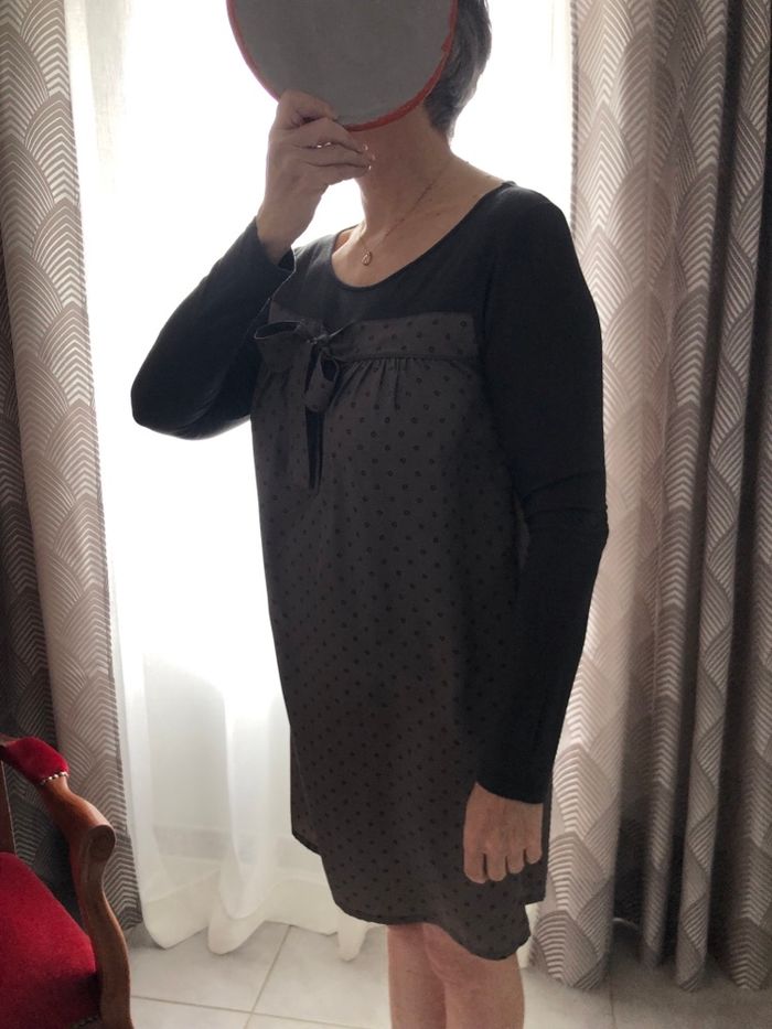 Vends cette petite robe très mignonne pour les fêtes, manches longues (longueur 58 cms) grise avec petits motifs imprimés, empiècement et manches 95 % viscose et 5% elasthane, robe 100% polyester, légèrement froncée sous empiècement avec noeud à nouer. Longueur robe 87 cms. Taille M.