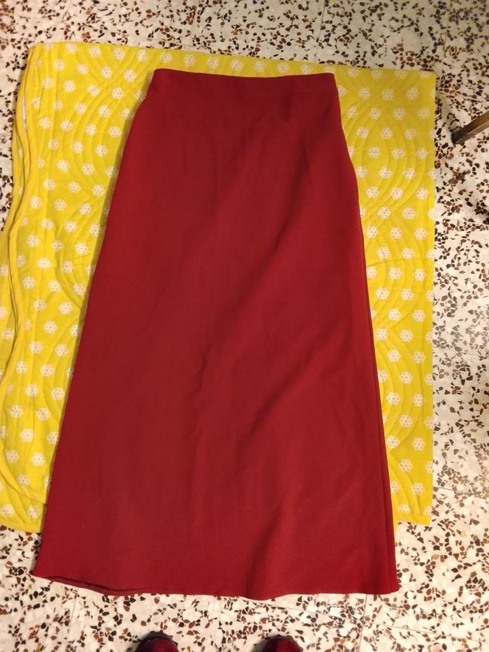 Bonjour, très belle jupe a offrir pour Noël de la marque Eteick en taille 38 en bordeaux. Fermer par fermeture éclair sur le cote gauche. Doubler a l'interieur. En très bon état et sans étiquette : hauteur devant ; 96cm, largeur: 50cm pensez a vos cadeaux de fin d'année.