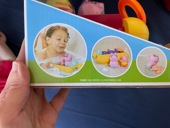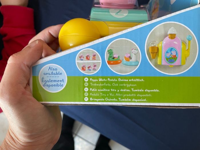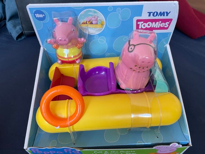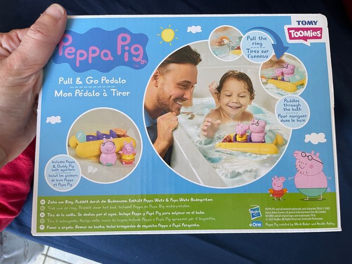 🧸 Description • Produit : Peppa Pig – Pull & Go Pedalo • Marque : TOMY • Âge recommandé : 18 mois et + • Contenu : • Un pédalo flottant jaune avec poignée • Deux figurines Peppa Pig (Peppa et George) • Fonction : jouet de bain flottant ; l’enfant tire/pousse le pédalo sur l’eau, idéal pour le bain ou une petite piscine • Objectifs : développer la motricité, l’imagination et rendre le bain plus ludique