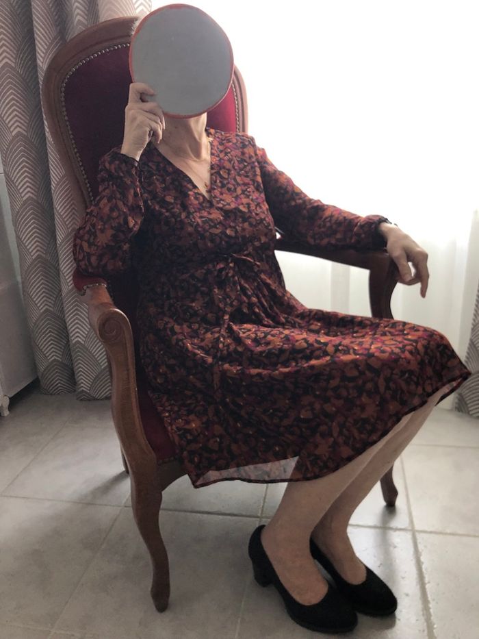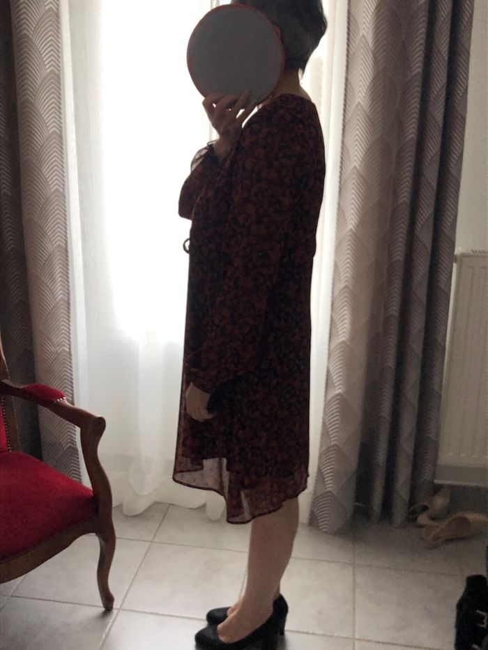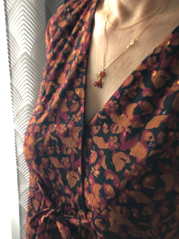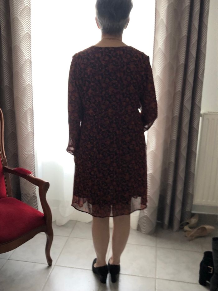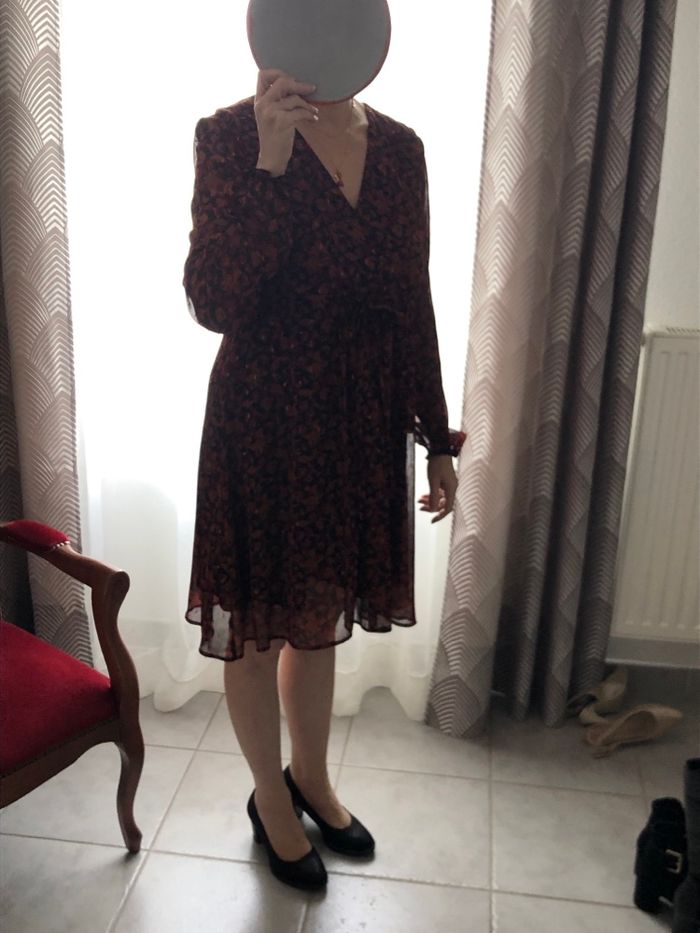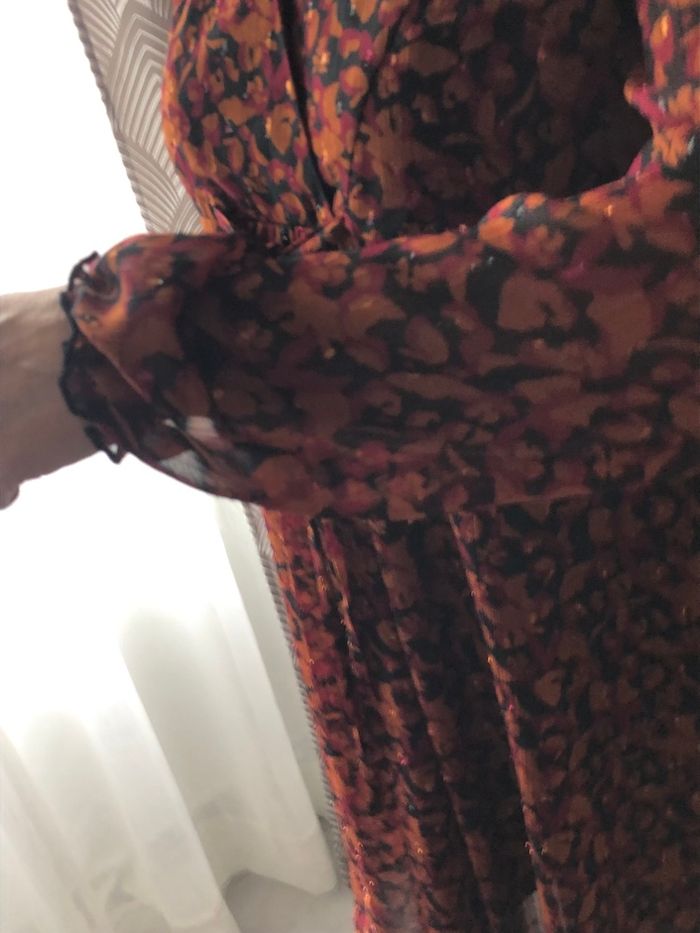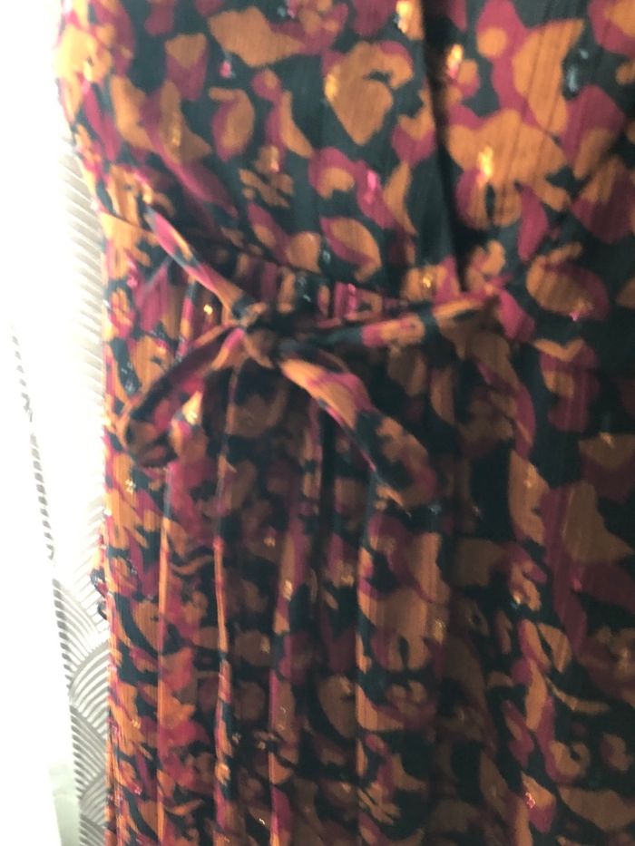 Vends cette robe parfaite pour les fêtes, entièrement doublée, manches longues élastiquées aux poignets, décolleté en V, froncée à la taille avec lien petit noeud. Tissu voile avec pointes déco fils de lurex.