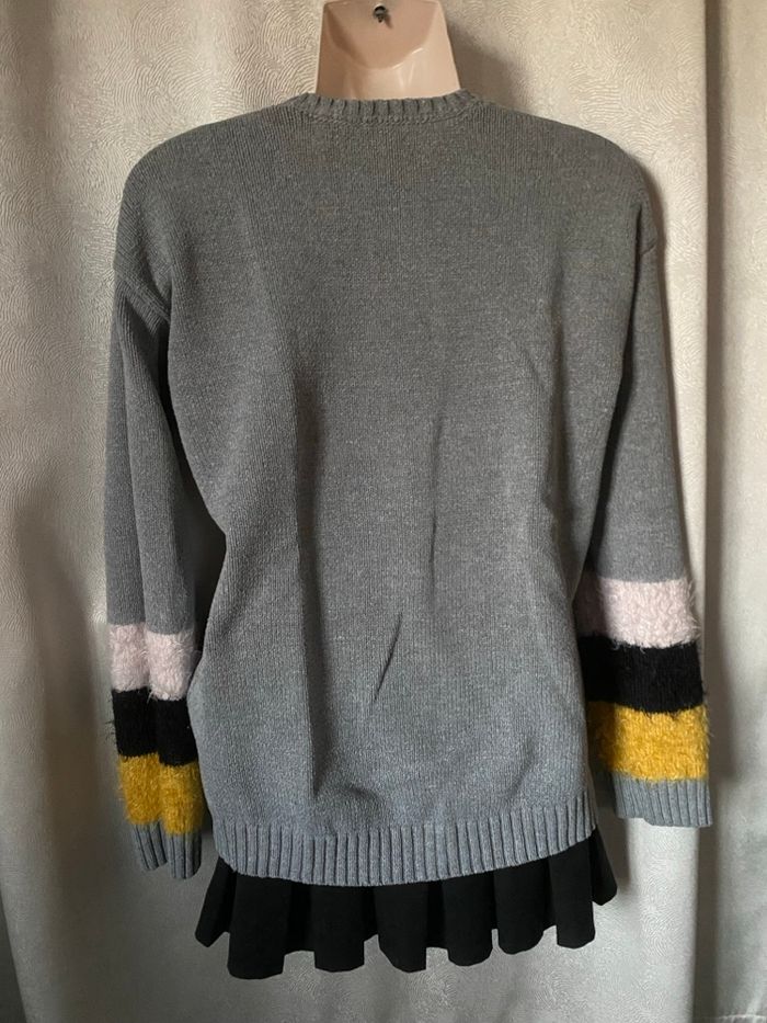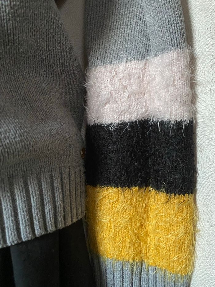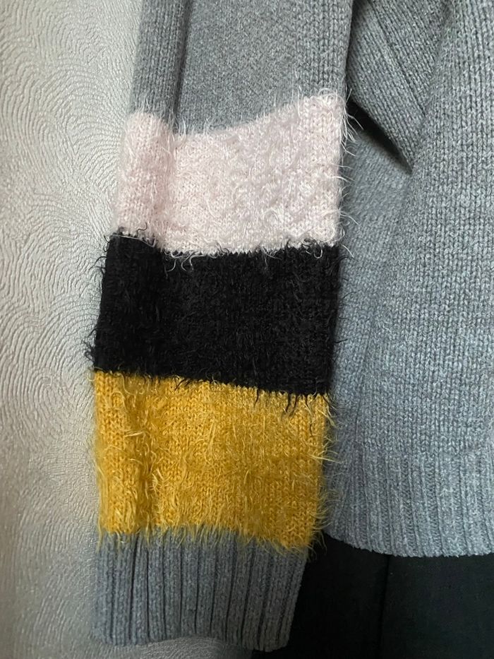 Pull gris larges bandes poilues en bas des manches rose pale noir et jaune L Esprit - photo numéro 9