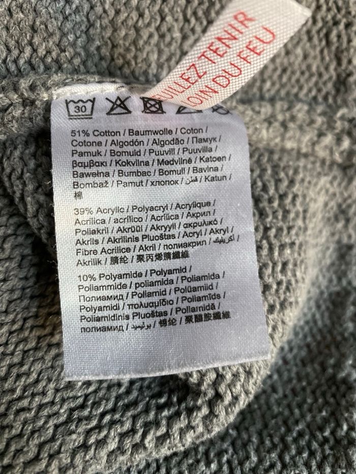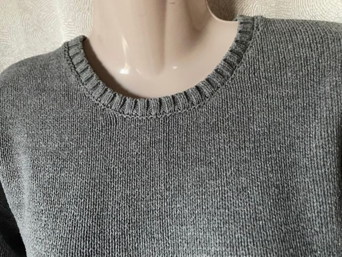 Pull gris larges bandes poilues en bas des manches rose pale noir et jaune 51 % coton, 39 % acrylique 10 % polyamide Taille L Esprit Carrure 49 cm Aisselle à aisselle 50 cm Longueur devant 64 cm, dos 66,5 cm