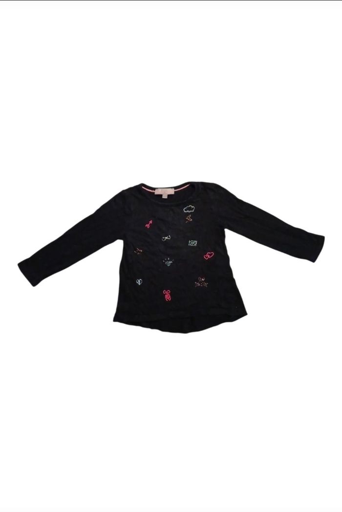 T-shirt Haut bébé fille 2 a 3 ans li manches longues – noir décoré de petits motifs colorés discrets qui apportent une touche originale et élégante. Matière douce et confortable, facile à assortir avec un legging, un jean ou une jupe. Idéal pour un look chic au quotidien.