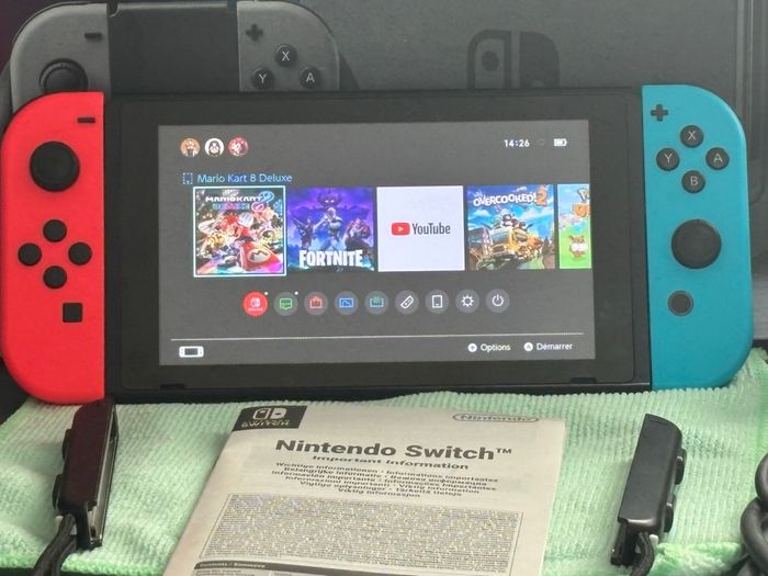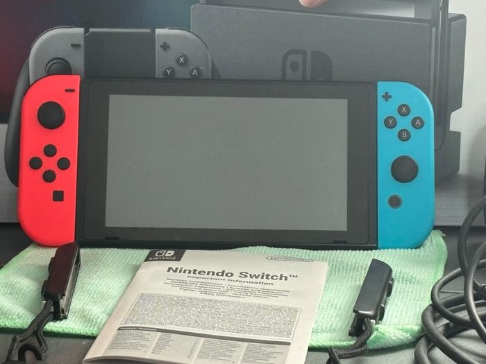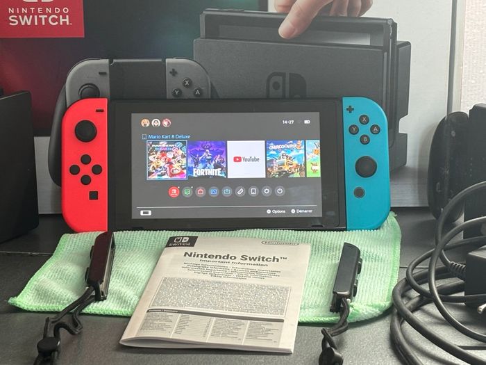 La switch 1 est vendue avec : 2 manettes (rouge et bleu), 2 joycons, 1 porte manette, dock (support TV), câble hdmi, câble d’alimentation mode d’emploi et boîte d’origine.