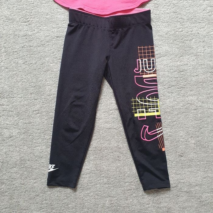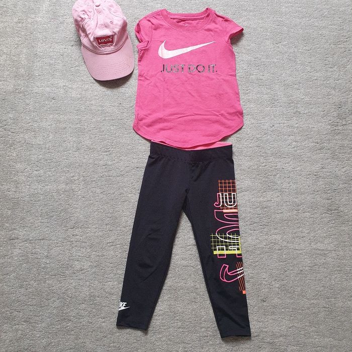Je vends cet ensemble de sport pour fille de la marque Nike, composé d'un t-shirt rose et d'un legging noir. + 1 casquette Levi's
