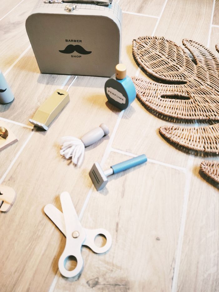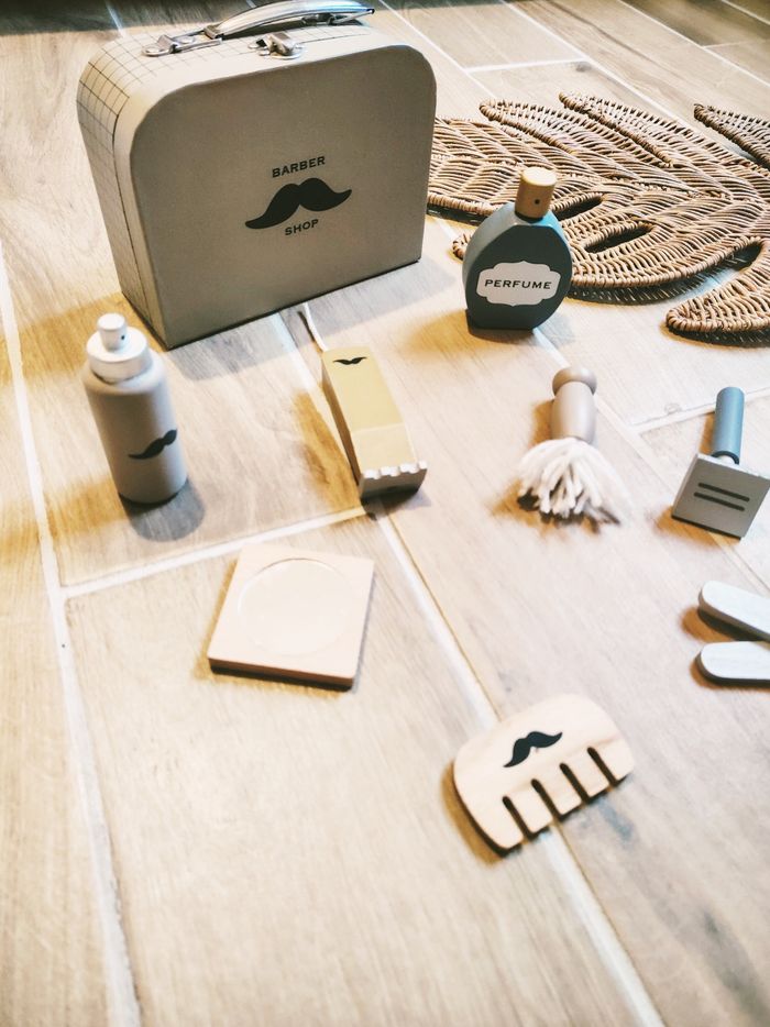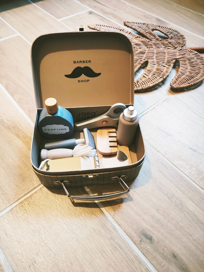 🧔Jeu d'imitation - Mallette de barbier avec divers accessoires en bois marque Jabadabado JB1104
