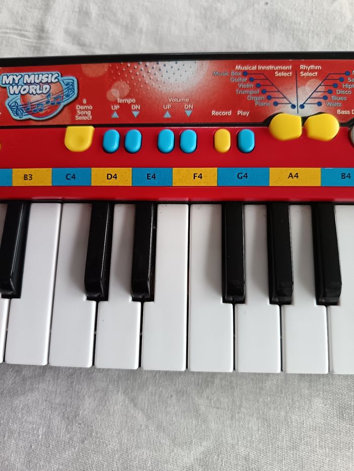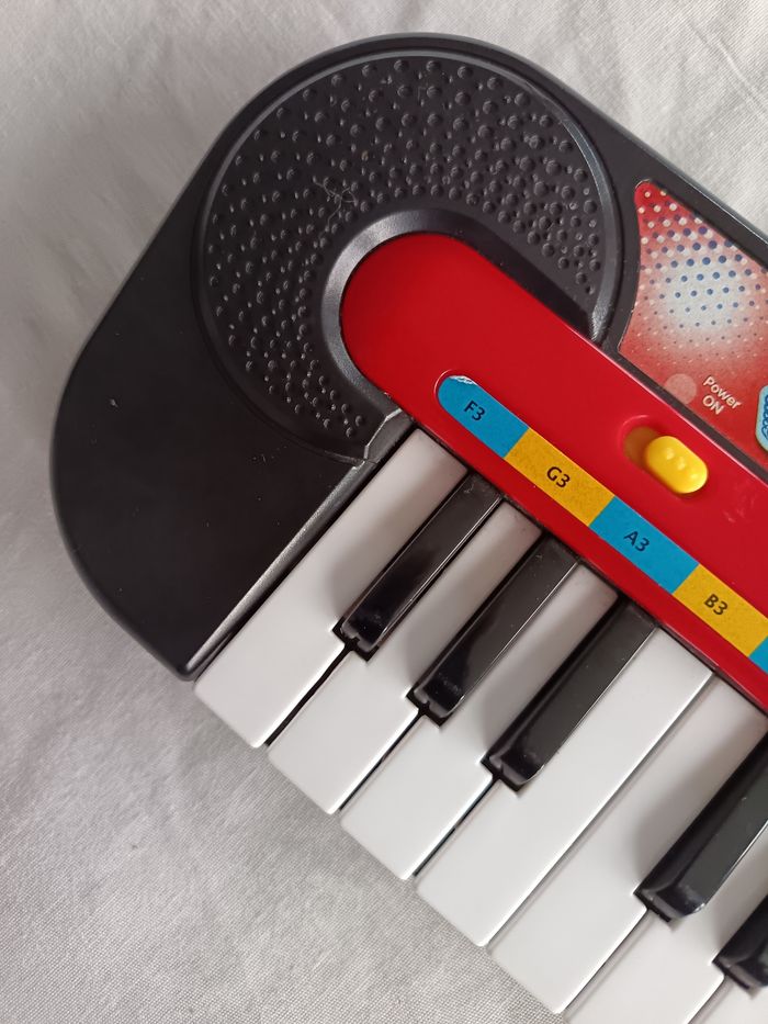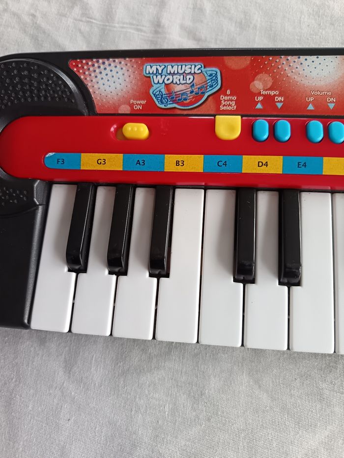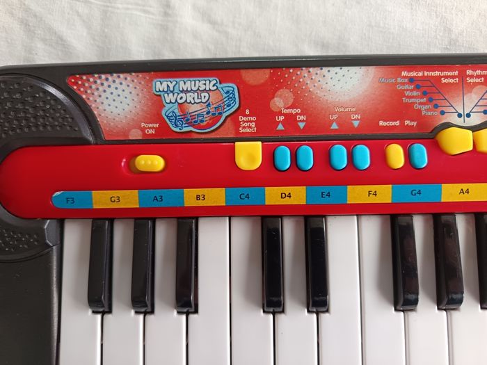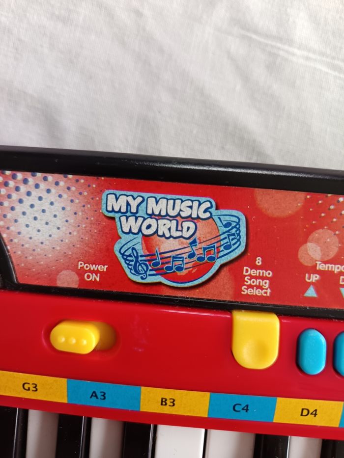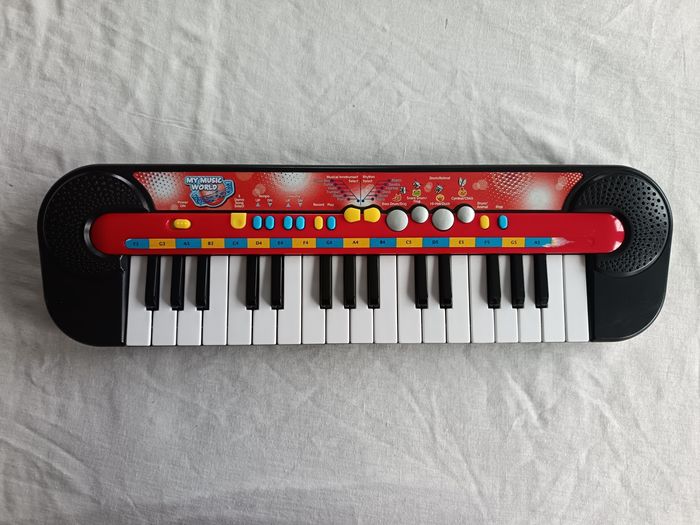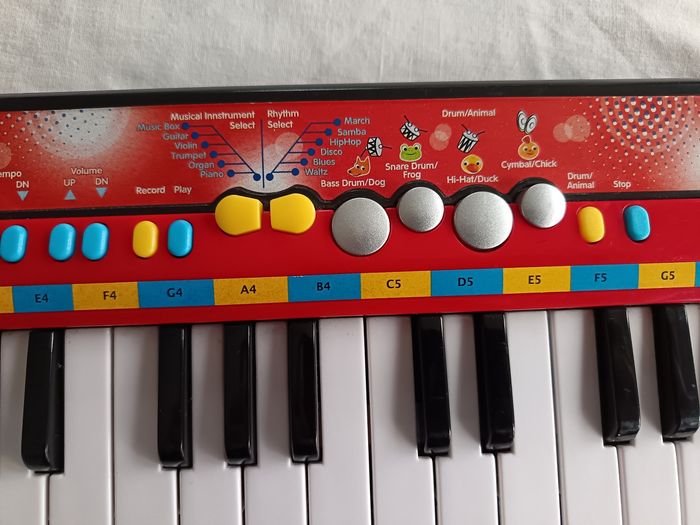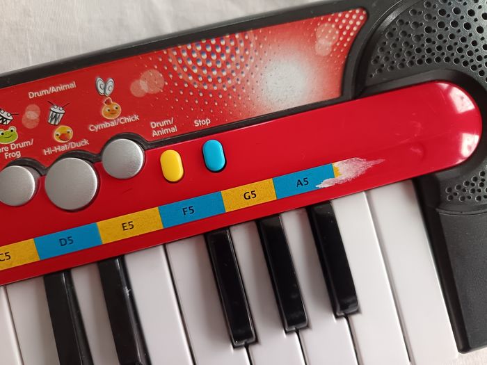 Jouet piano pour enfants Marque auchan Des petites traces d'usure sont présentes sur le jouet Manque des autocollants par endroit Des griffes sont visibles à l'arrière du piano Mais reste tout de même en bon état Fonctionne correctement. Piles incluses (elles ont été changées)