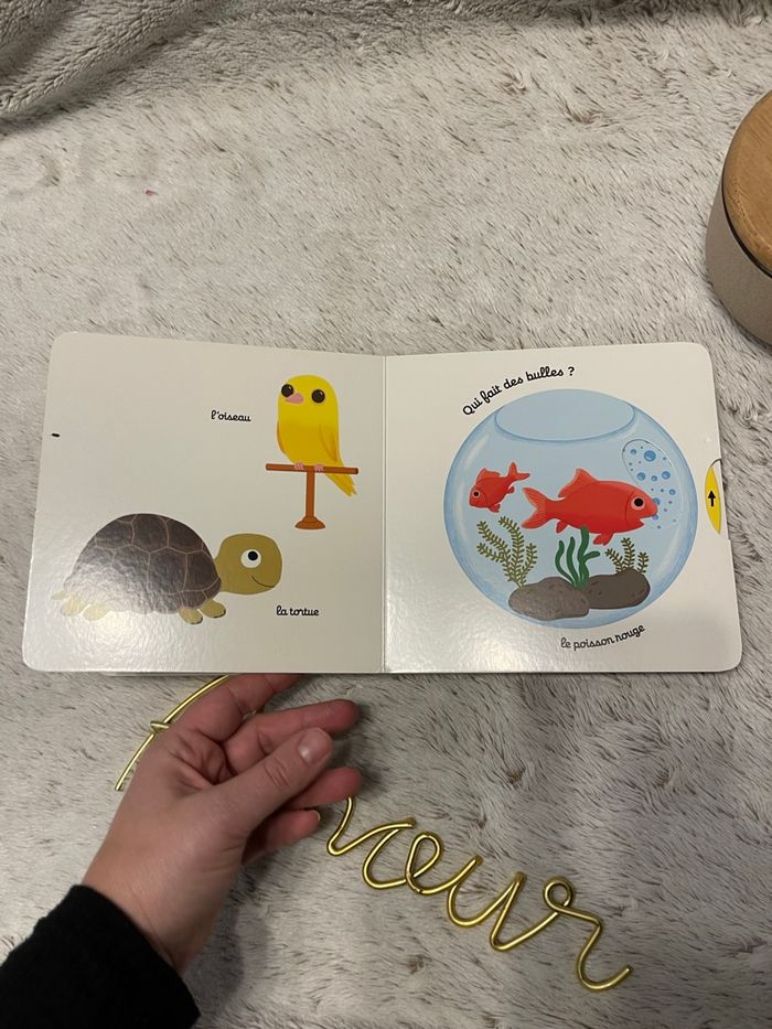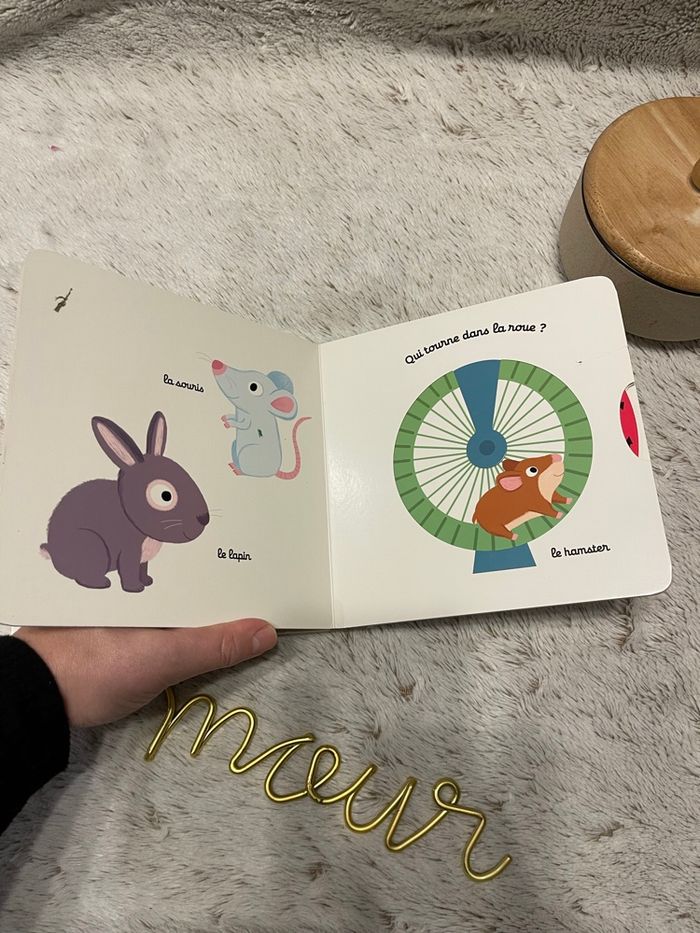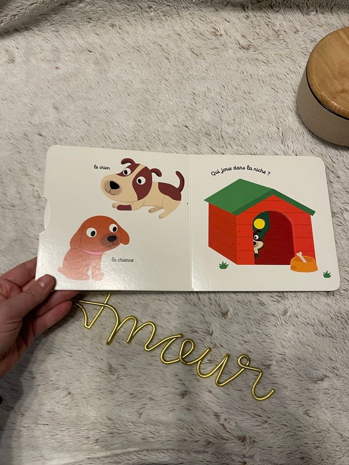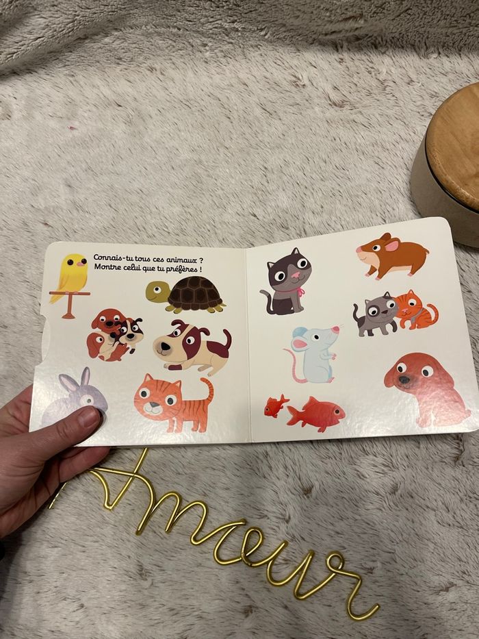 Ce titre s'insère dans une série de premiers imagiers interactifs que l'on a judicieusement réalisés sur de très épaisses pages cartonnées conçues pour résister aux petites mains. Ce sont quelques animaux familiers qui sont présentés ici, depuis l'oiseau jusqu'au lapin en passant par le chien, le chat, la tortue, le poisson rouge ou le hamster. Sur chaque double page, deux animaux sont déclinés en regard d'une saynète introduite par une question (ex. Qui joue dans la niche?) permettant de découvrir une espèce supplémentaire qui s'anime grâce au maniement d'une tirette. Toutes les images sont finalement réunies à la fin de l'ouvrage afin de permettre à l'enfant de tester sa mémoire en nommant les différentes bêtes rencontrées au fil des pages. [SDM].