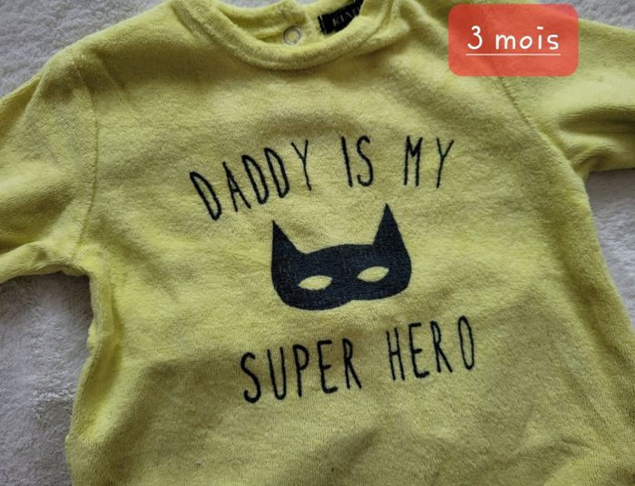 Design : Couleur jaune vif avec une inscription craquante "Daddy is my Super Hero" et un motif masque.