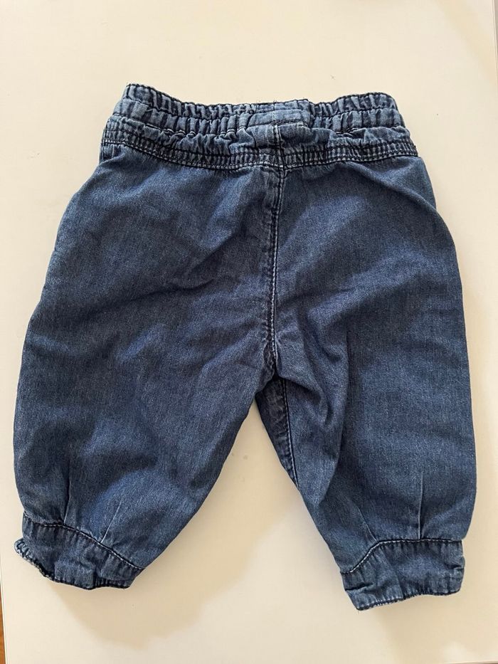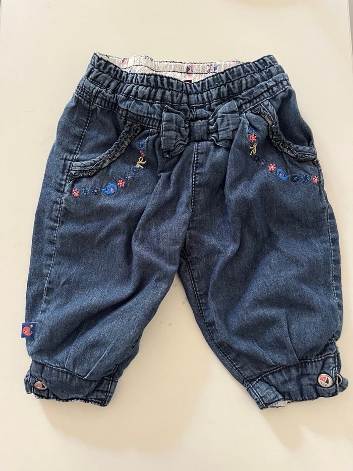 Ensemble 3 pièces gilet, tee-shirt manches courtes et pantalon jean, motif Baleines. Taille 6 mois.