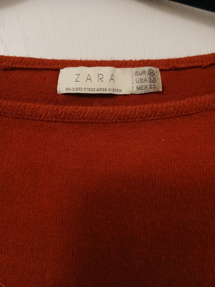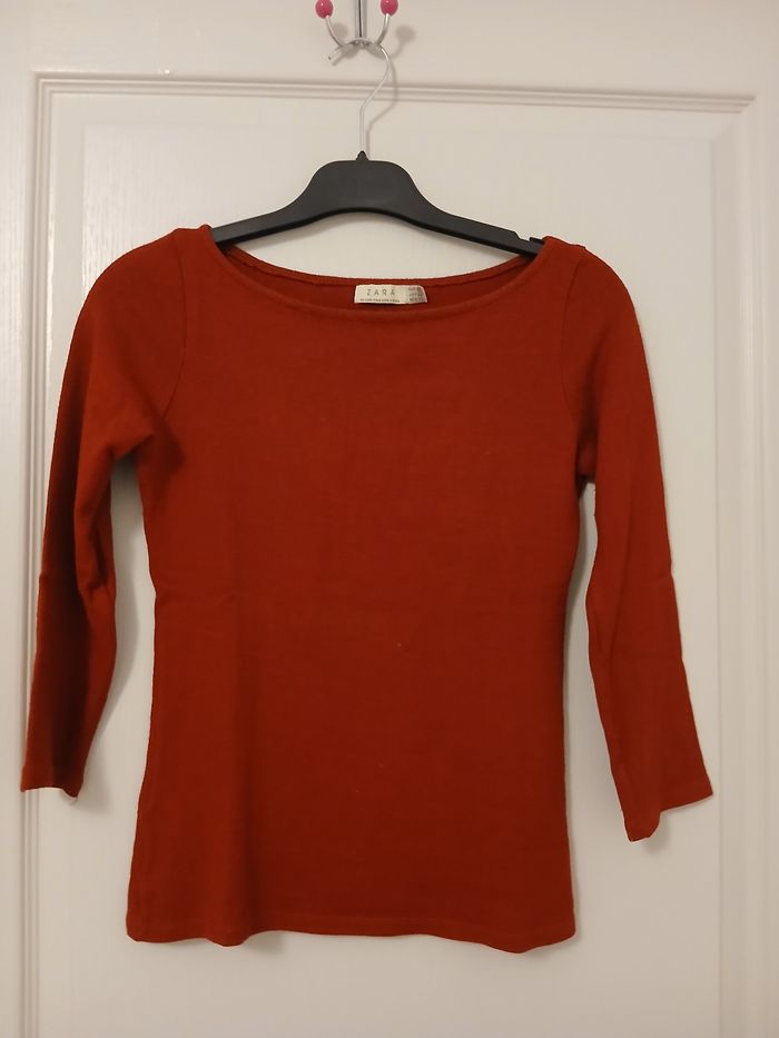 Haut manches 3/4, rouge, en viscose et polyamide. 32 cm de largeur des épaules 38 cm de largeur des aisselles 52 cm de longueur