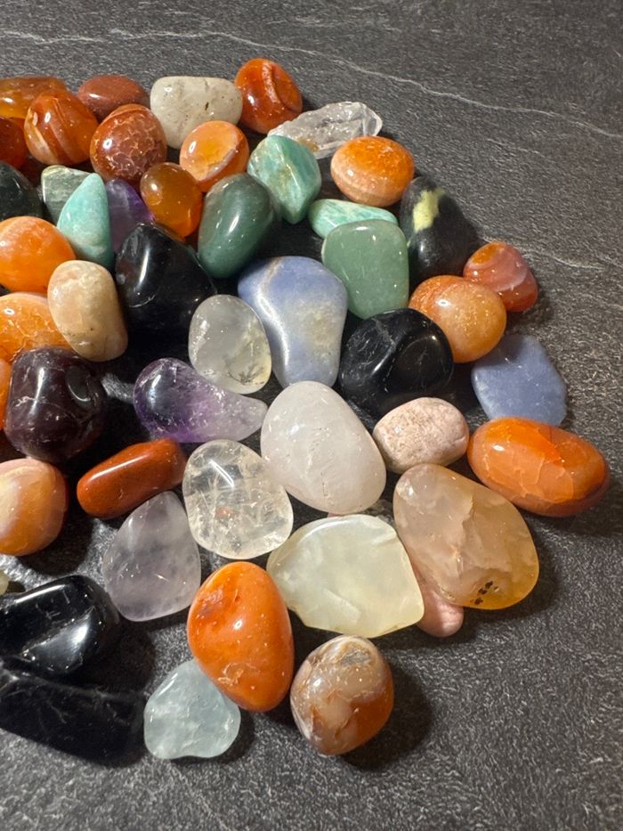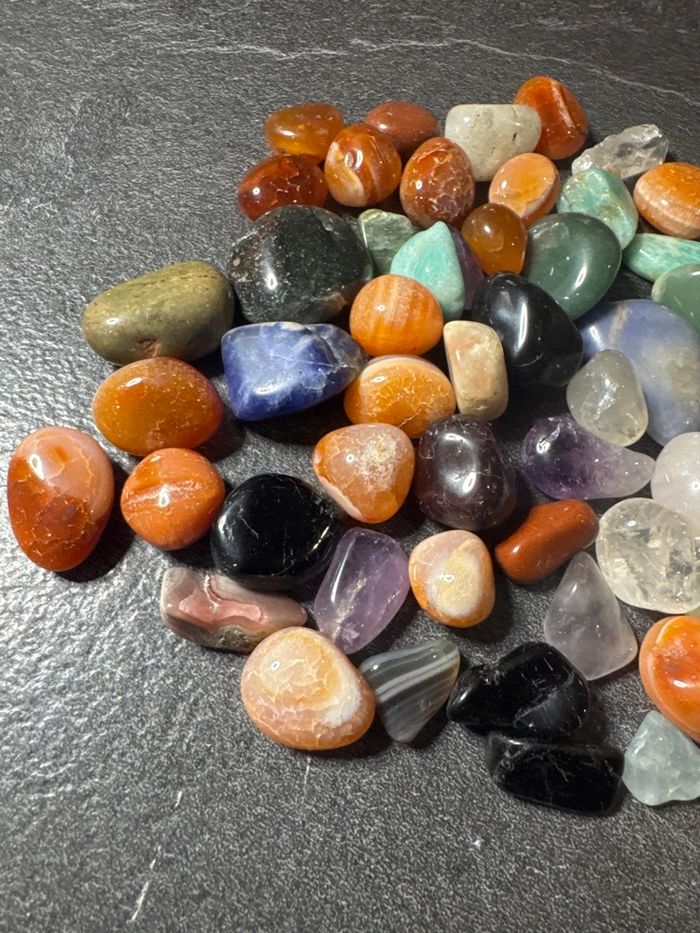 Mélange varié : cornaline, améthyste, aventurine, agate, cristal de roche, jaspe, sodalite, obsidienne, etc.