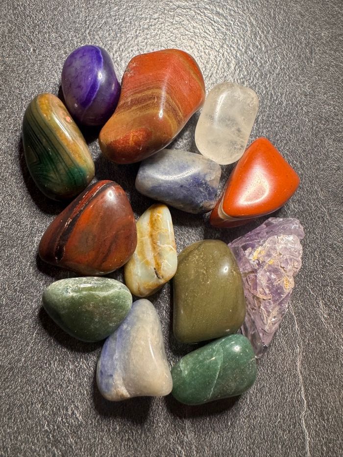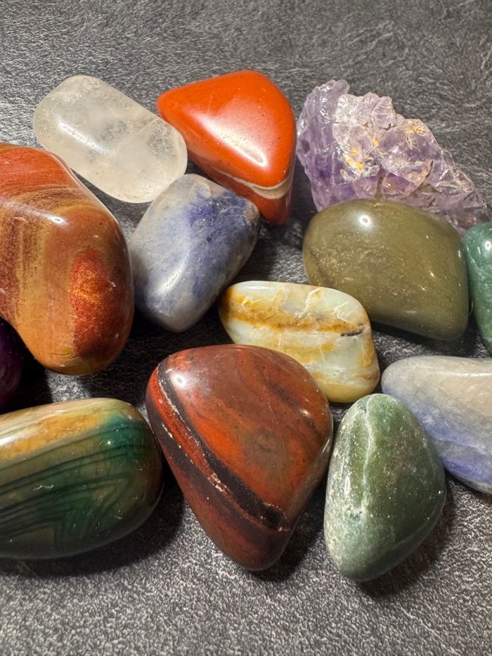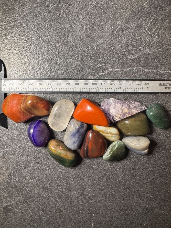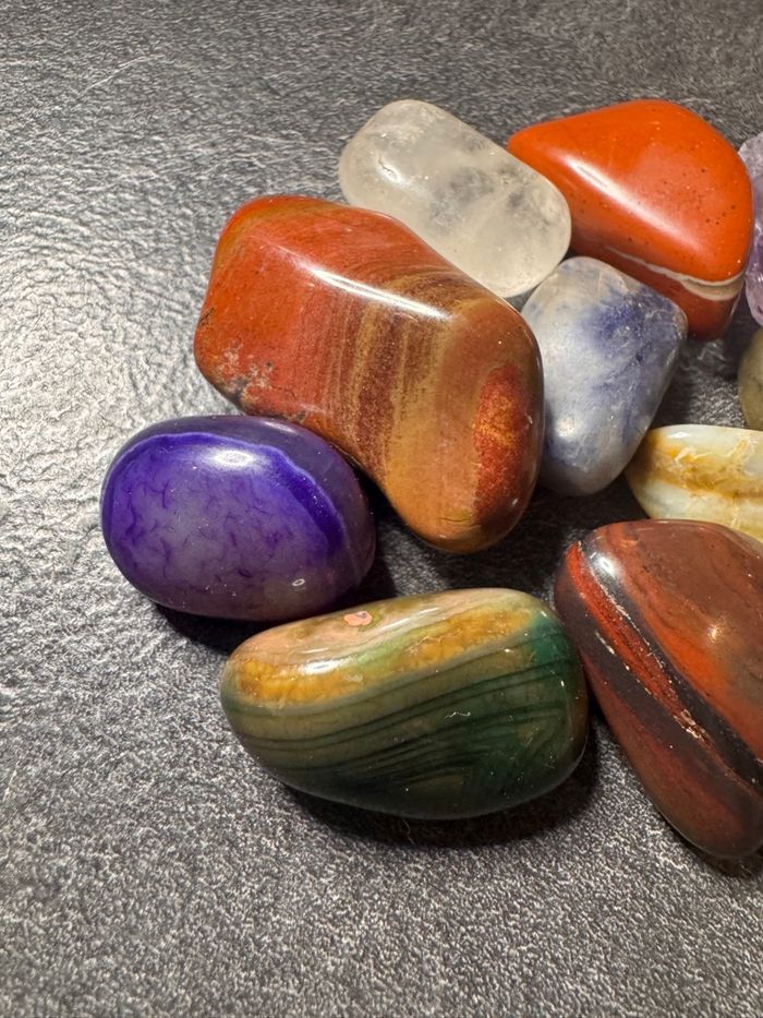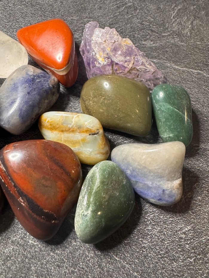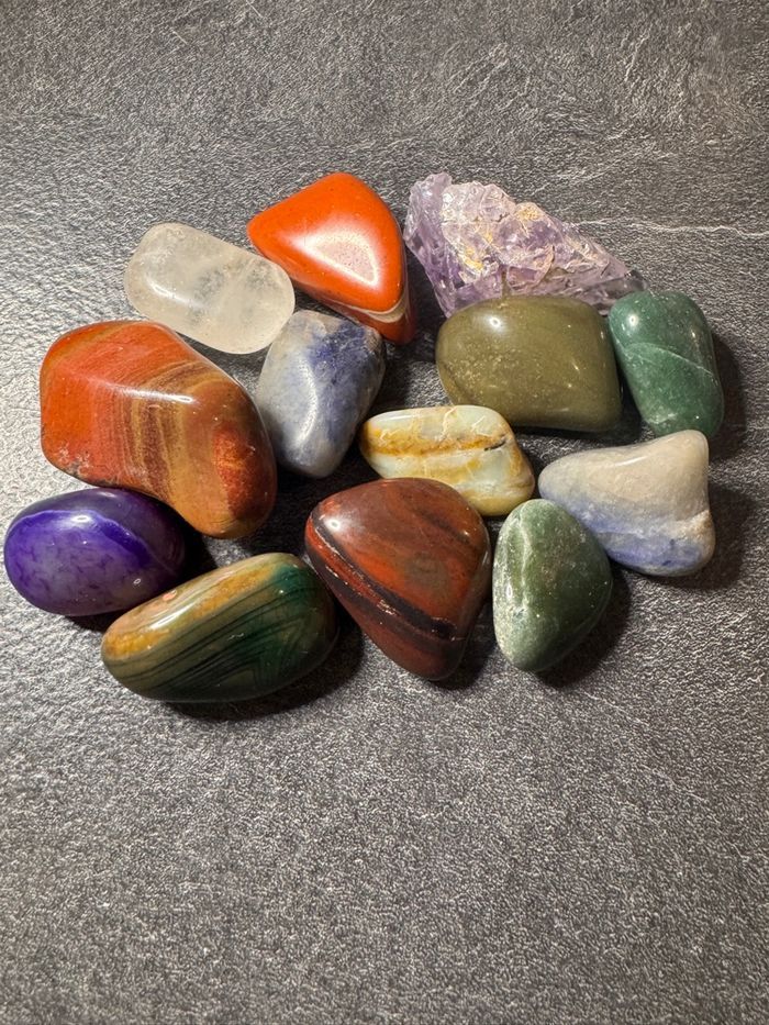 Lot d’environ 15 pierres roulées, pour un total de 280 g, en tailles L et XL. Mélange varié : jaspe rouge, cristal de roche, sodalite, aventurine, améthyste brute, agate, quartz, œil de faucon etc. Pierres en bon état, parfaites pour déco, collection ou lithothérapie. Envoi rapide, expédié le jour même.
