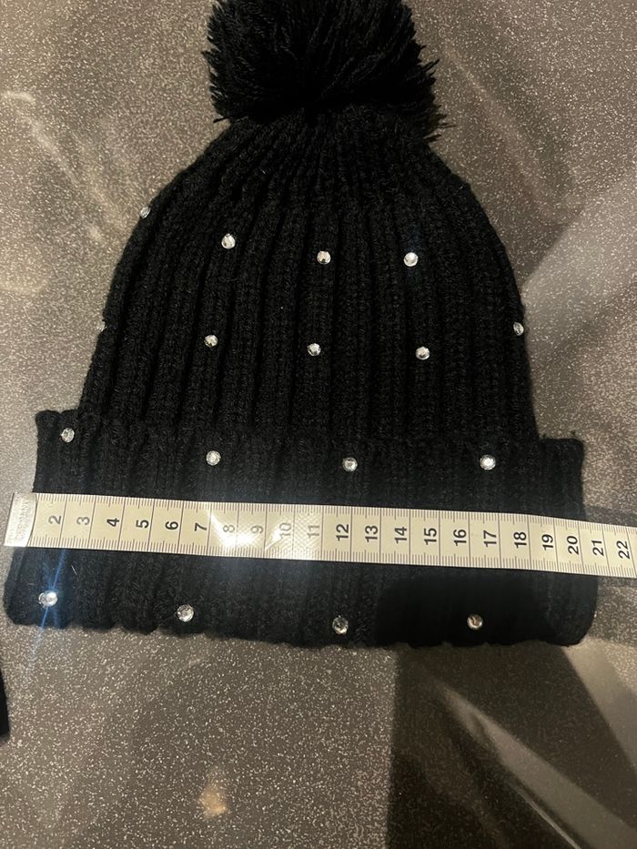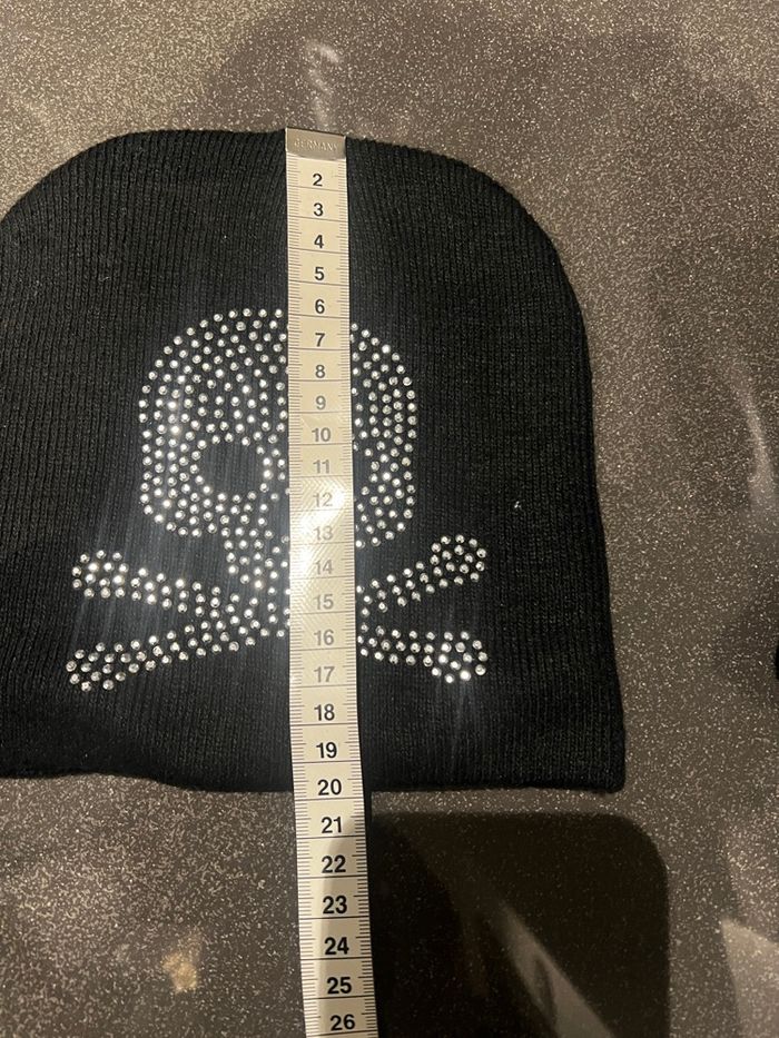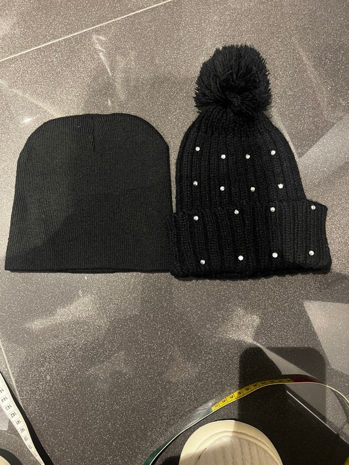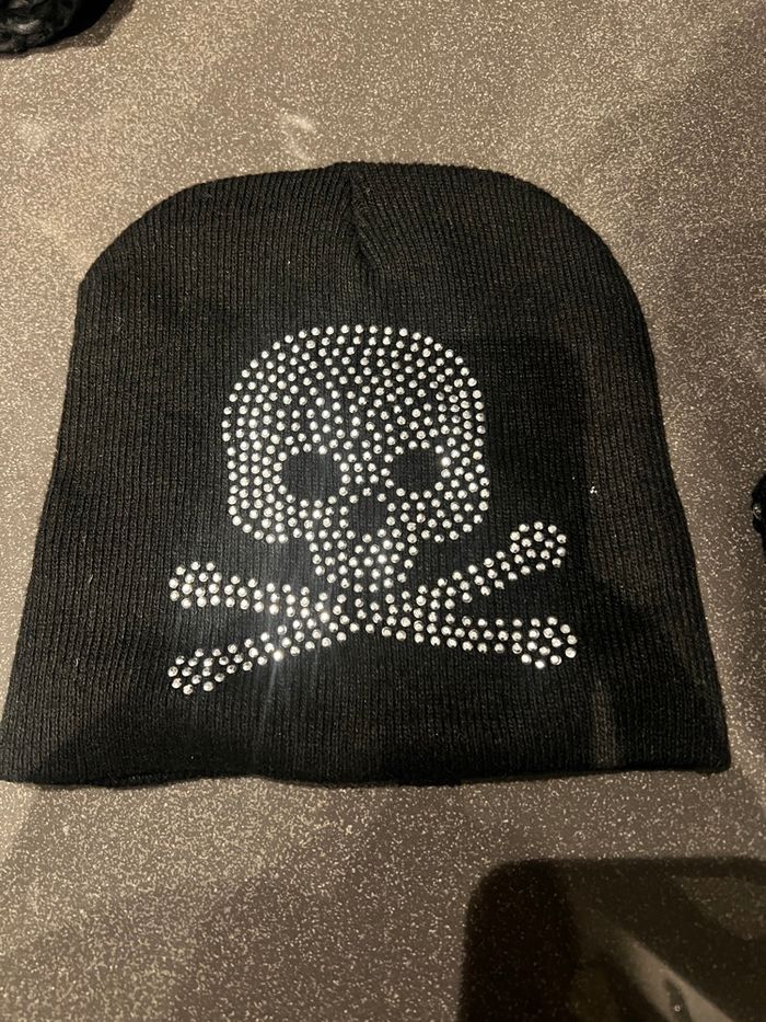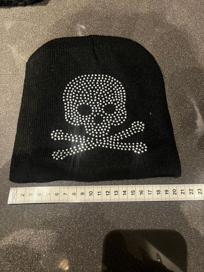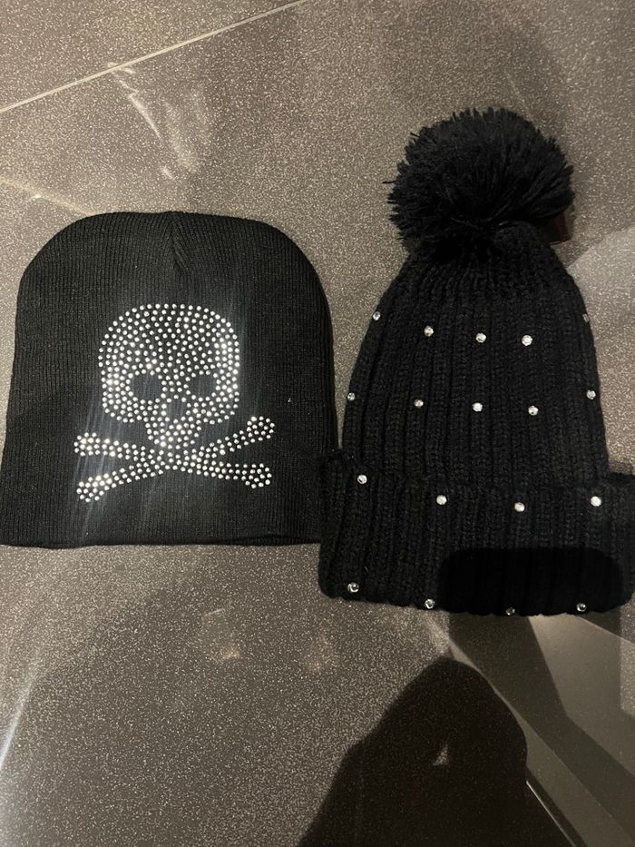 Ce lot comprend un bonnet à pompon en grosse laine épaisse et un bonnet beanie plus léger en laine fine avec motif tête de mort. Les deux sont extensibles, très confortables et en excellent état sans aucun strass manquant.