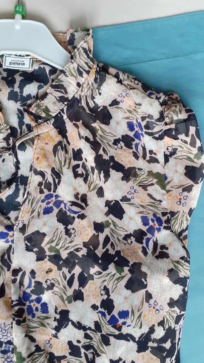 Vends une robe manches longues 100 % polyester, doublée par un fond de robe à bretelles noir, petite collerette et liens à l'encolure, élastique à la taille, volant à la base, couleur beige avec motifs noir et bleus, marque Pimkie, taille 38.