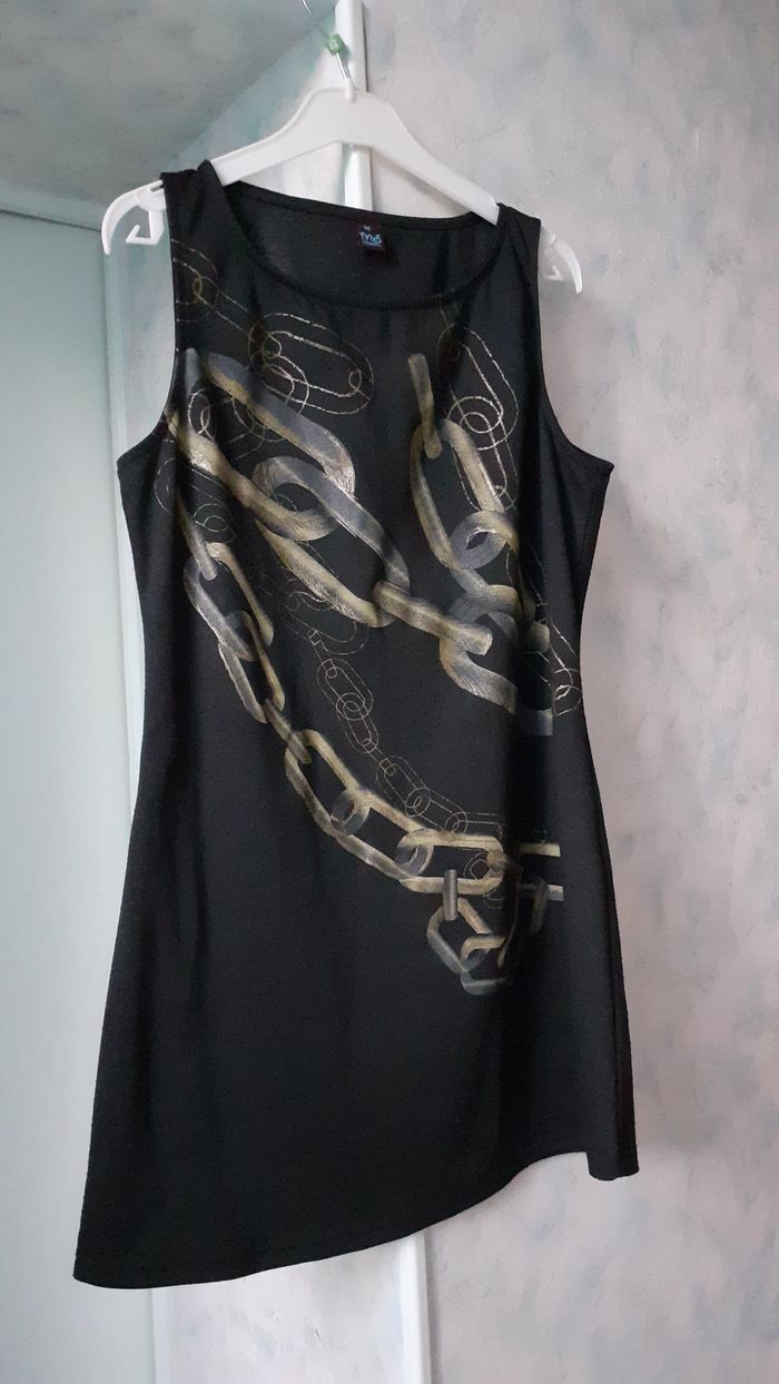 Vends une robe sans manche, 72 % polyester, 23 % élasthanne, tissu épais, non doublé, couleur noir avec motifs dorés, marque MS Mode, taille M.