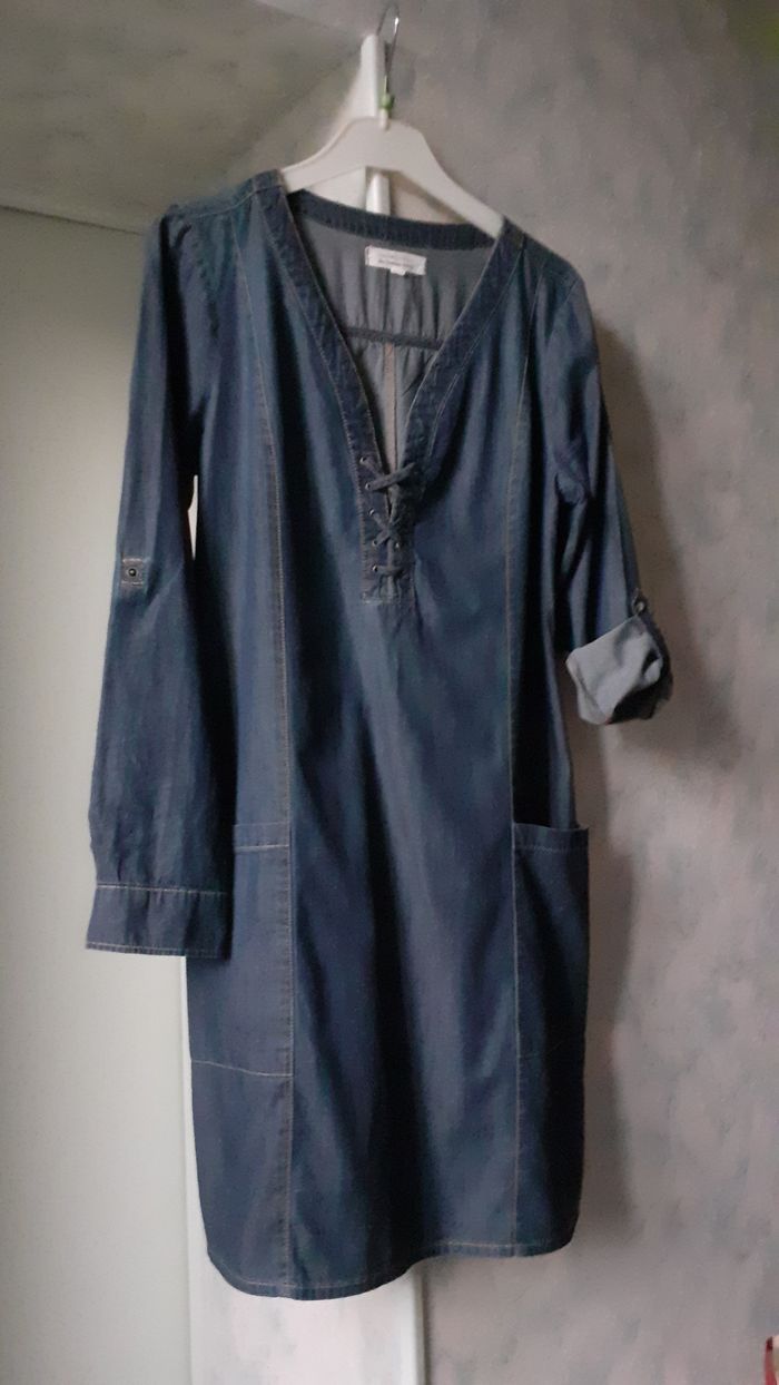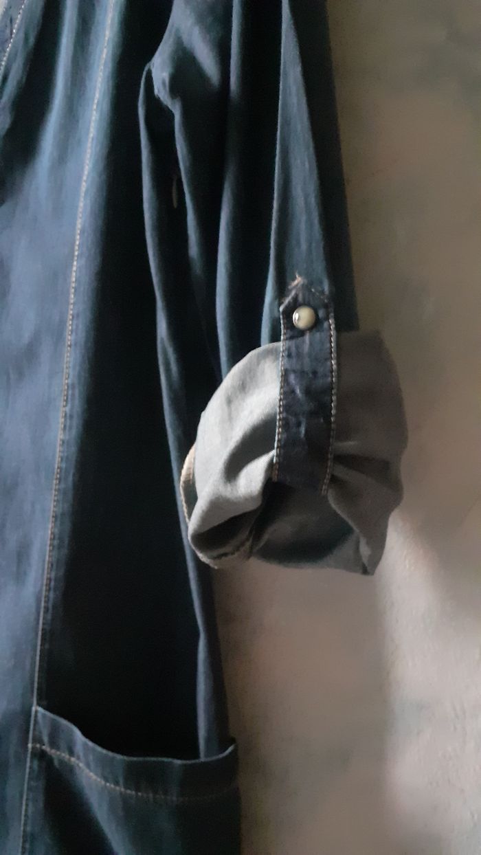 Vends une robe droite, manches longues qui peuvent se retourner, 100 % coton, jean fin et souple, liens croisés sur le buste, 2 poches plates, couleur bleu jean, marque Cache Cache My fashion basic, taille 36.