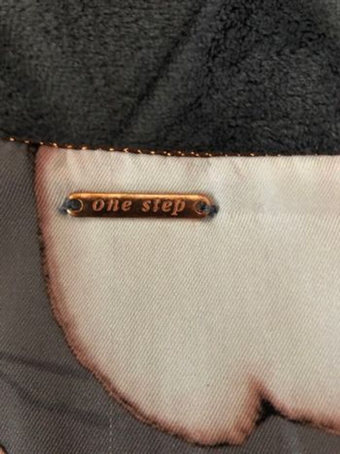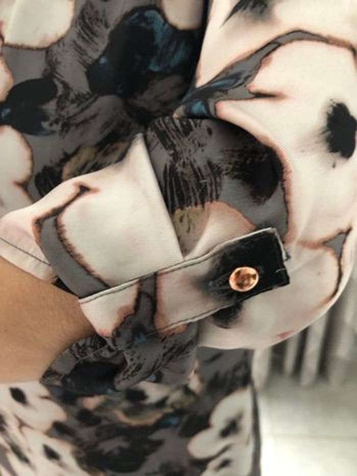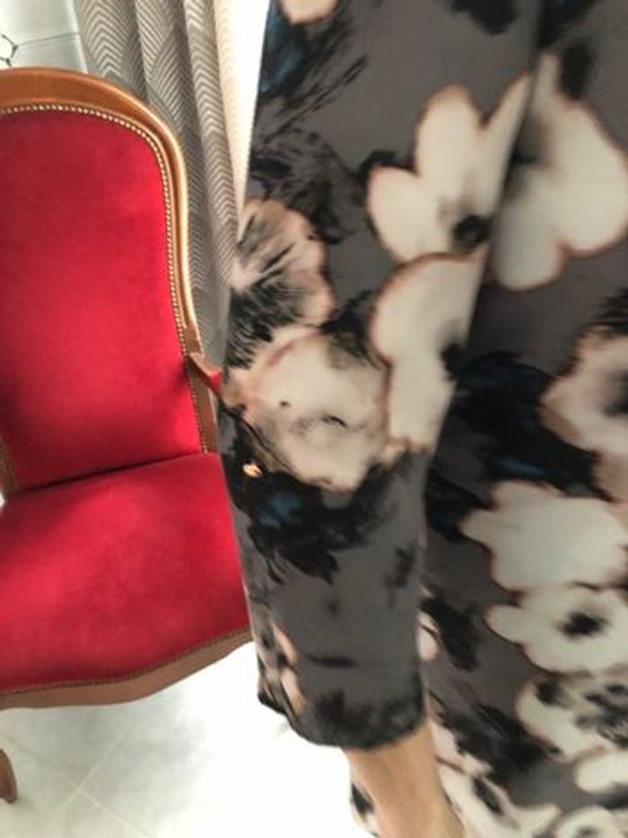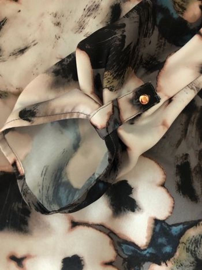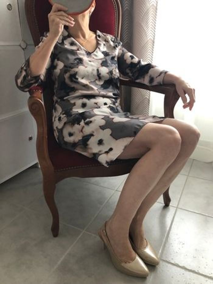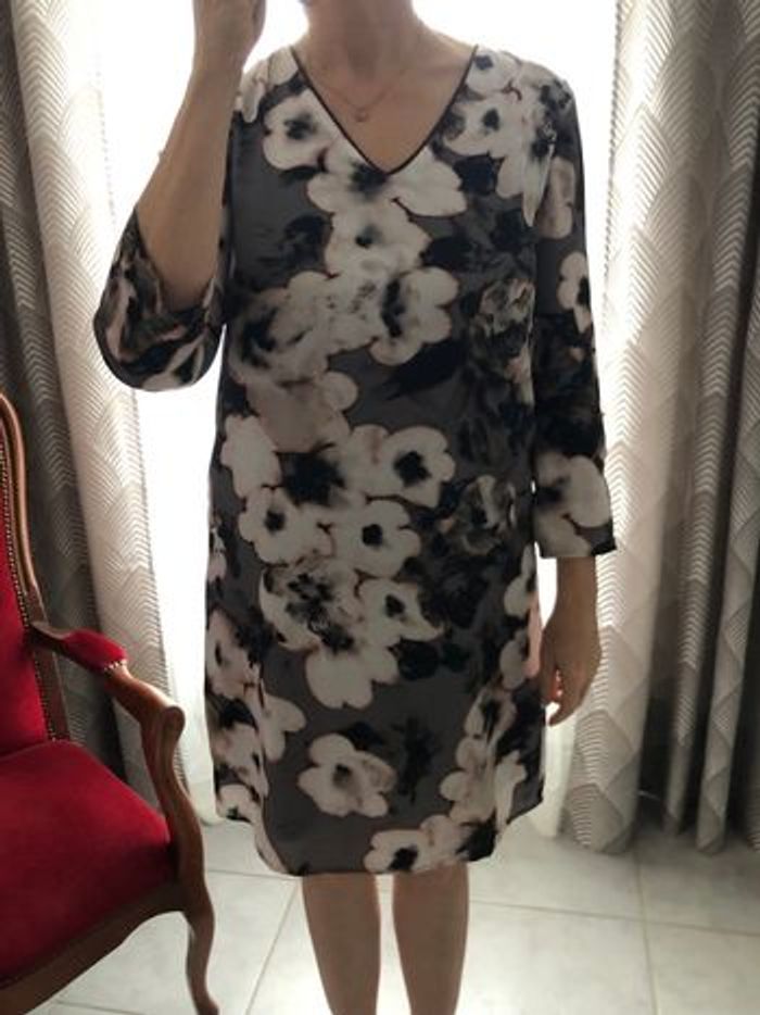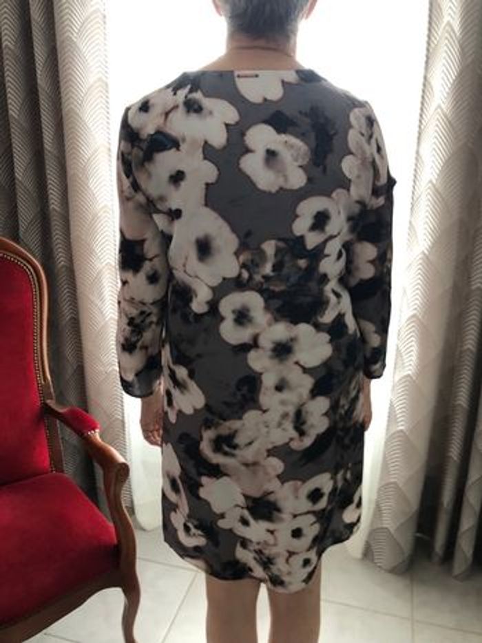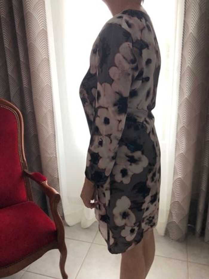 Vends, idéal pour s’habiller élégamment, superbe robe droite courte « One Step » doublée, manches longues (50 cms) tissu 100% polyester finition satinée, couleur imprimé fondu gris beige bronze doré, encolure en V bordée galon bronze irisé. Longueur robe 92 cms. Taille 38.