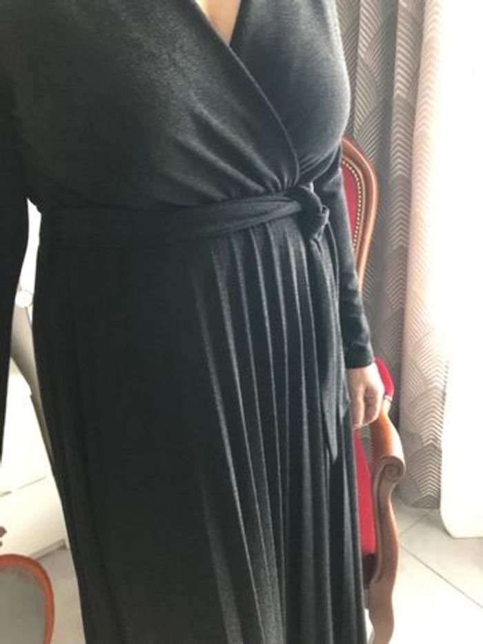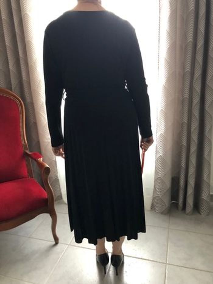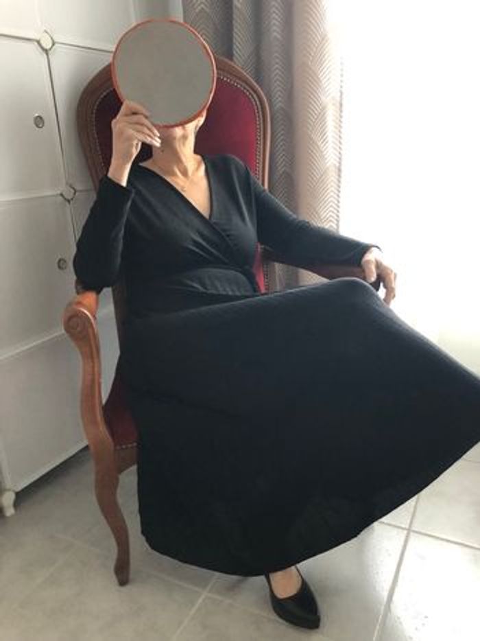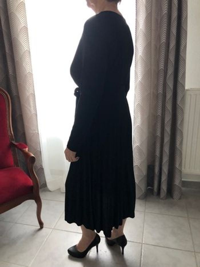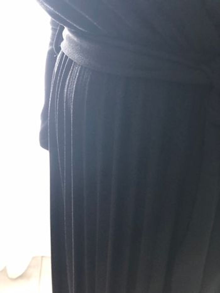 Vends, superbe pour une soirée, robe longue (sous les mollets) manches longues, tissu noir légèrement brillant , 97 % nylon et 3 % élasthane, encolure en V forme porte-feuille cousue à la taille, passants et ceinture assortie à nouer à la taille, jupe plissée soleil permanent, Longueur manches 57 cms Longueur robe 120 cms