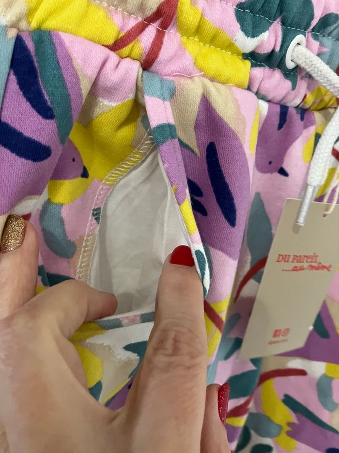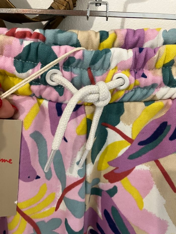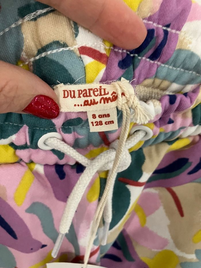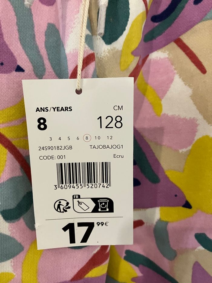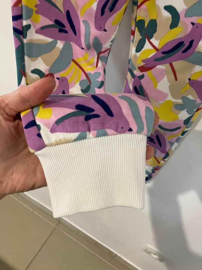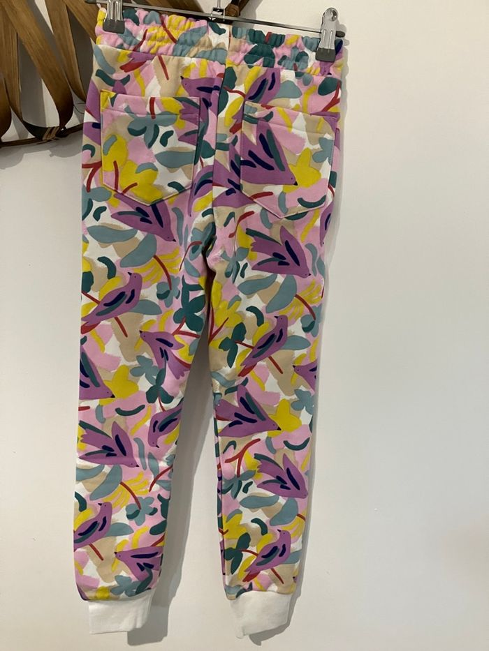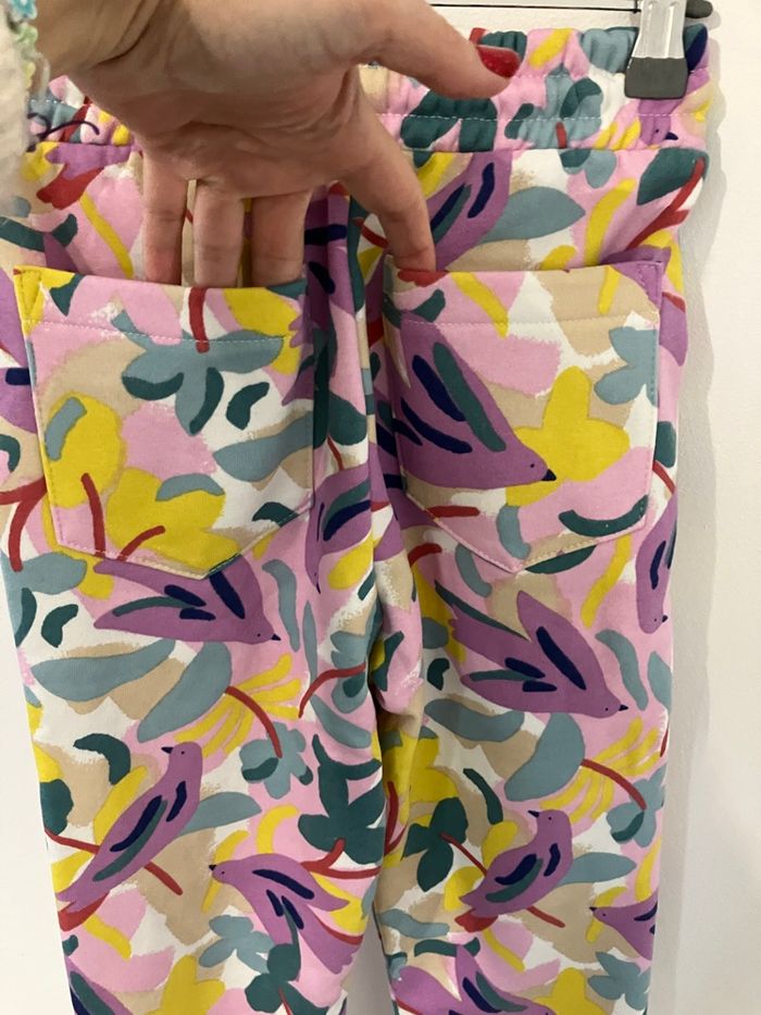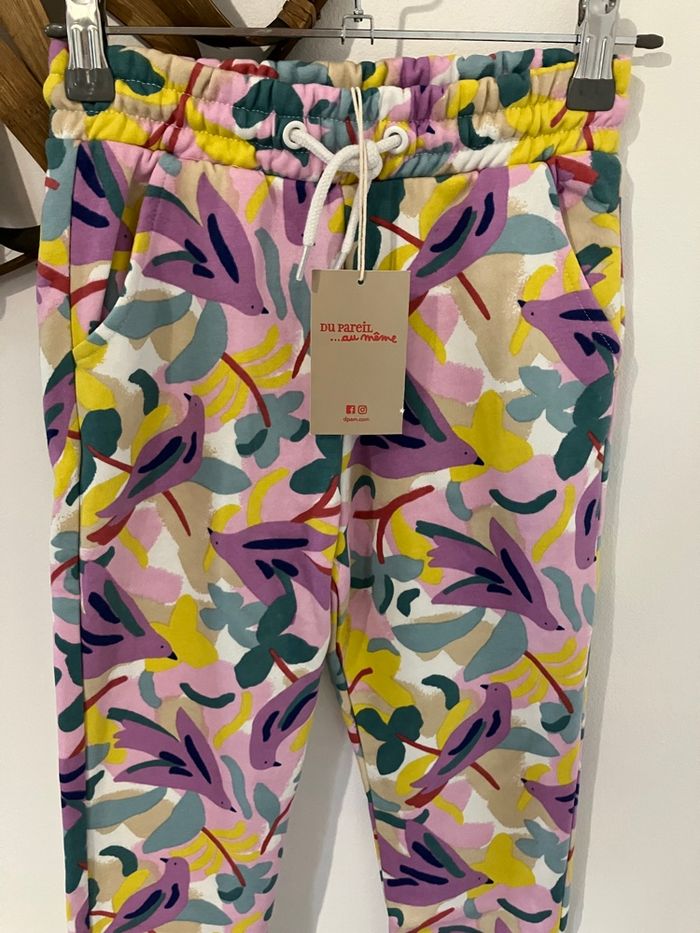 Pantalon souple type jogging. Fille taille 8 ans. Deux poches latérales, deux poches arrière, cordon de serrage devant. Intérieur chaud . Motif oiseaux multicolore.