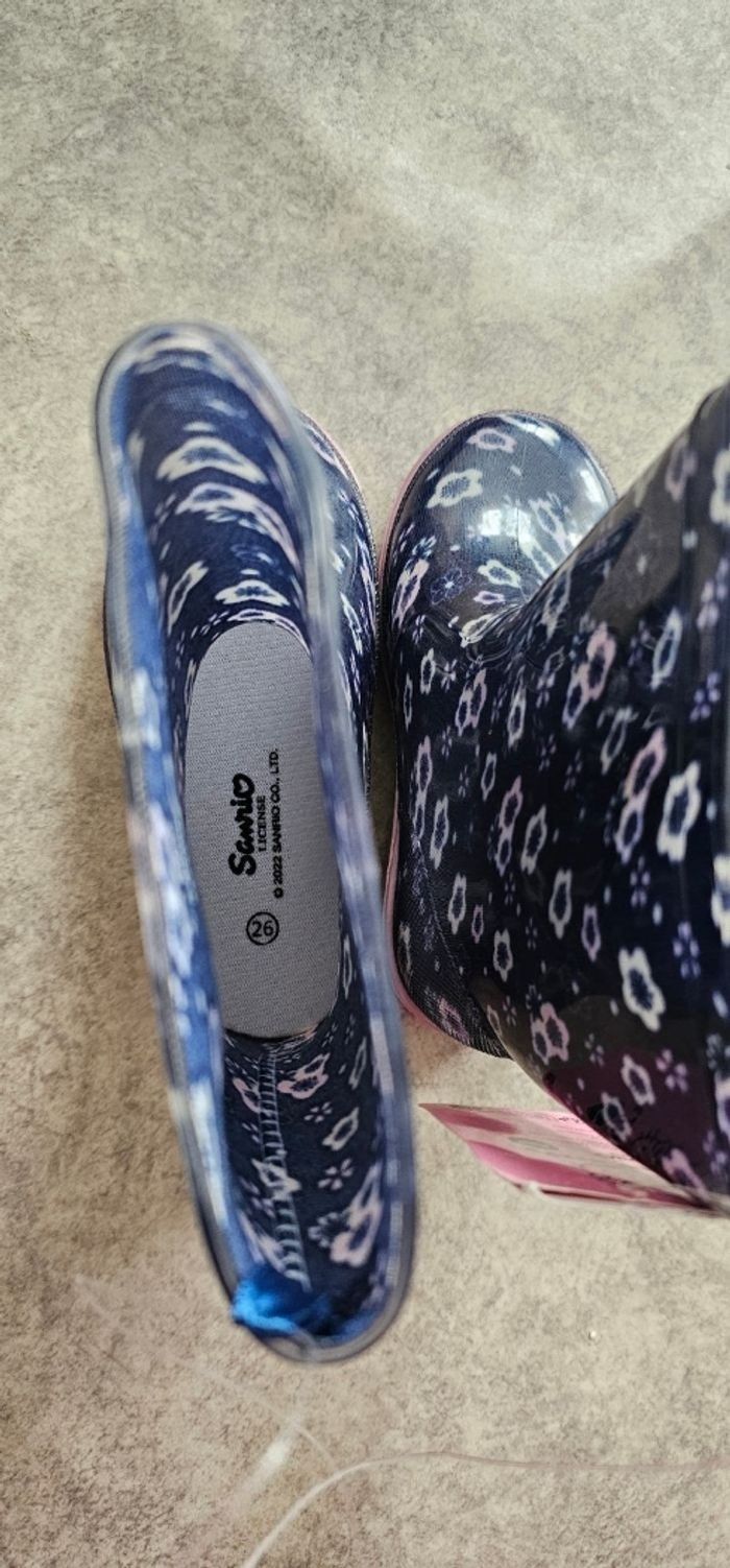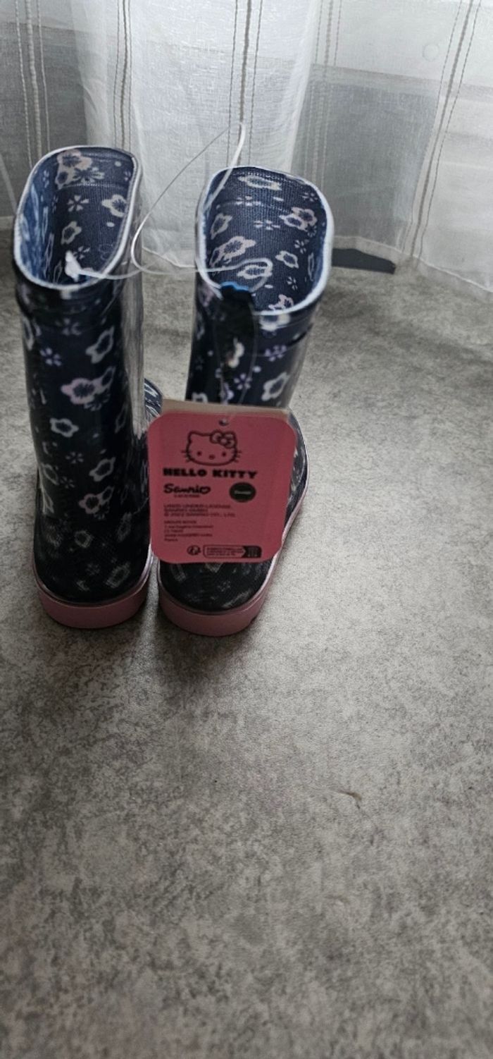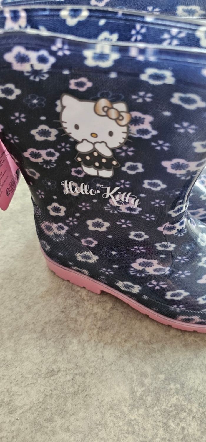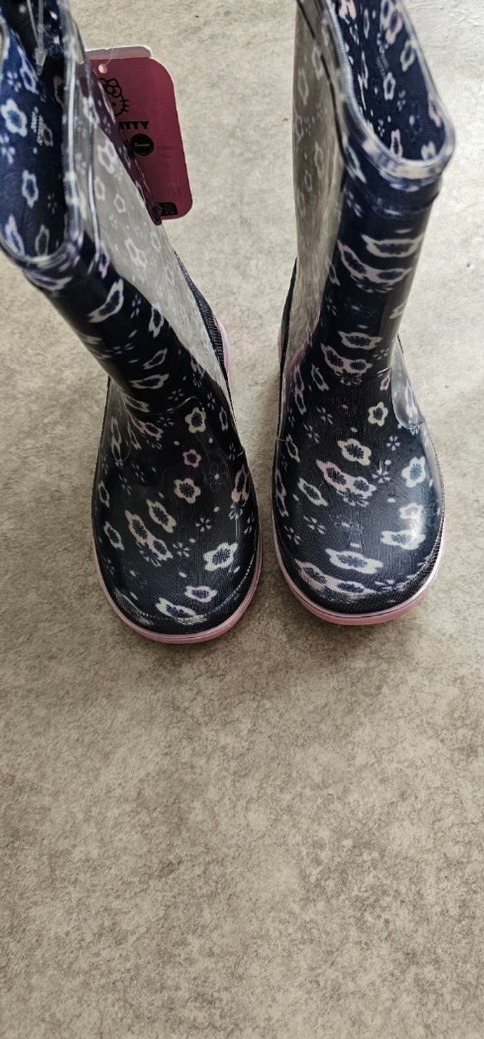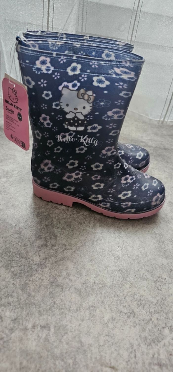 Jolies bottes de pluie Hello Kitty pour enfant, neuf avec étiquette. Couleur bleu marine avec motifs fleuris et semelles roses. Parfaites pour les jours pluvieux et très confortables. Taille : 26 Jamais portées. #hellokitty #bottesdepluie #enfant #fille #neuf #chaussuresenfant #modeenfant #cute #kawaii
