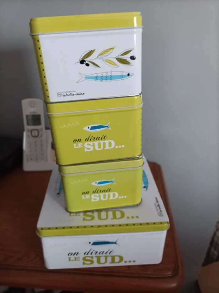 Lot 4 boites carrées en métal marque La Belle Iloise (on dirait le sud) dimensions grande boite 18,5 X 18,5 X 9 cm dimensions petites boites 11,5 X 11,5 X 8 cm