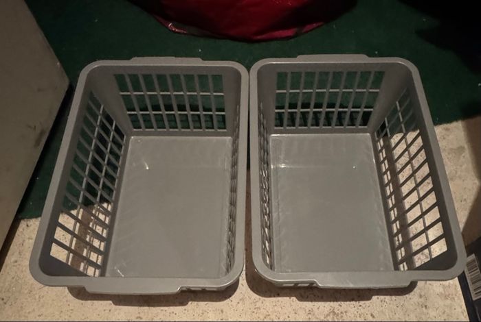 Je propose un lot varié de paniers et boîtes de rangement en plastique, tous en bon état. Différents modèles, tailles et couleurs disponibles : idéal pour organiser votre maison, votre buanderie ou vos affaires personnelles.
