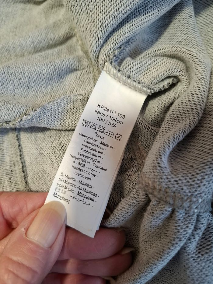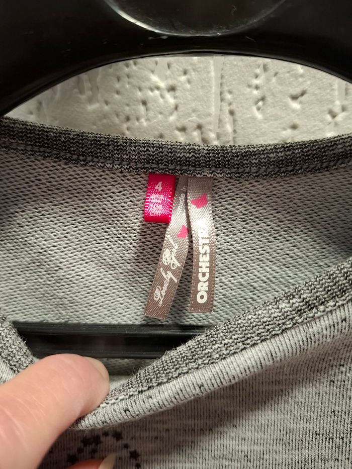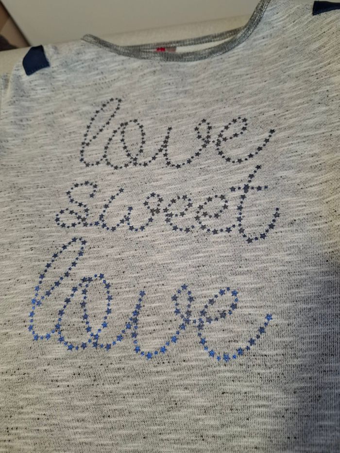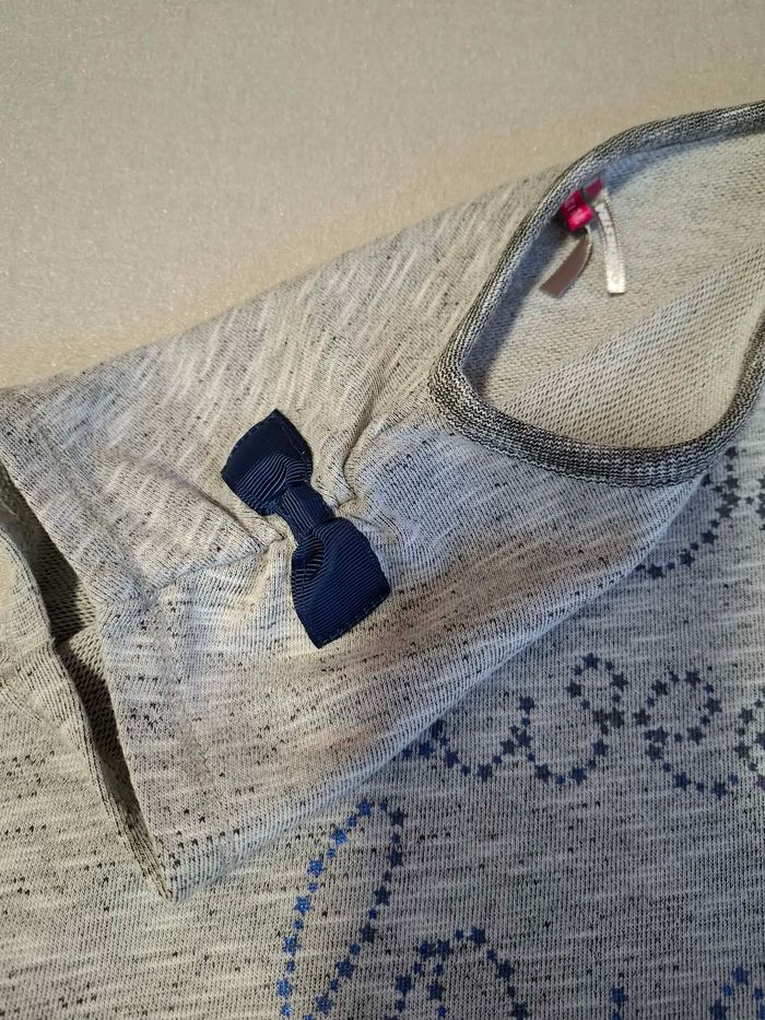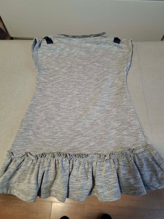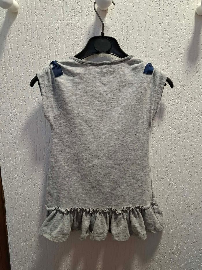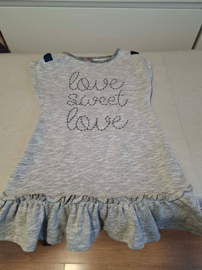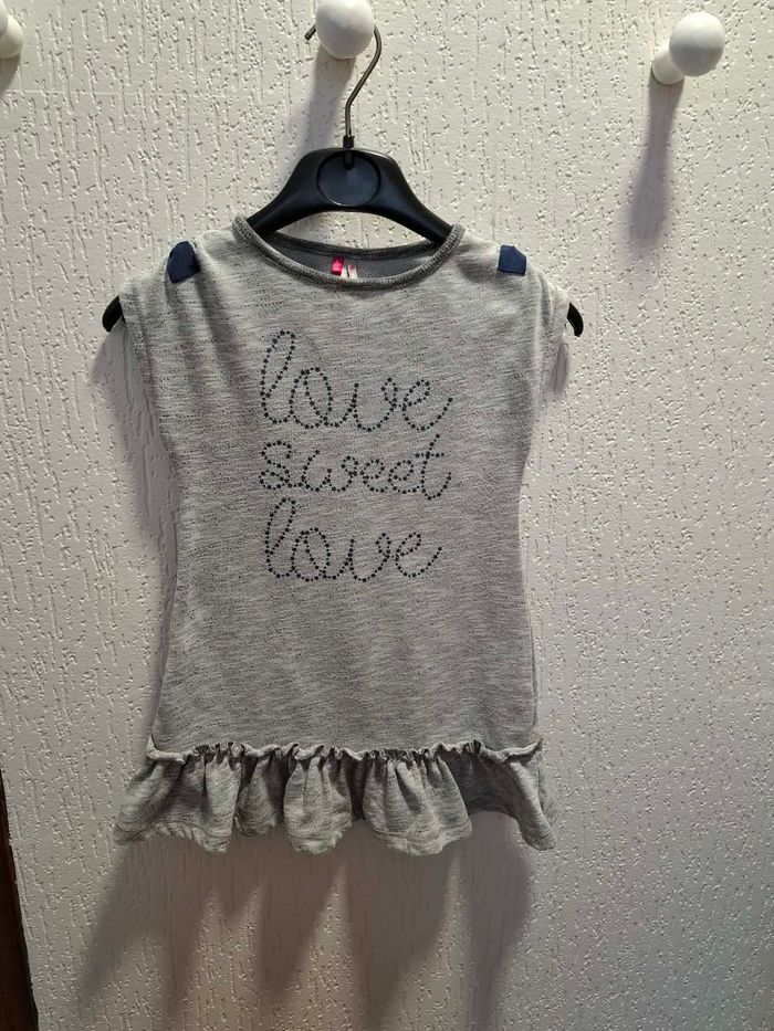 Jolie robe pour fille, marque ORCHESTRA, en taille 4 ans, sans manches, grand volant dans le bas, joli imprimé pailleté bleu "love sweet love", petits noeuds satin bleu marine sur épaules froncées, col rond, en 64 % coton et 36 % polyester, lavable en machine à 30° et en très bon état, portée 2 ou 3 fois.