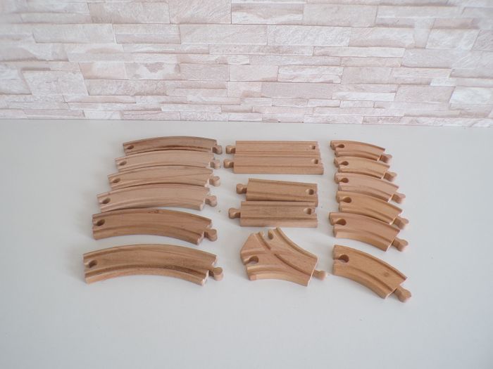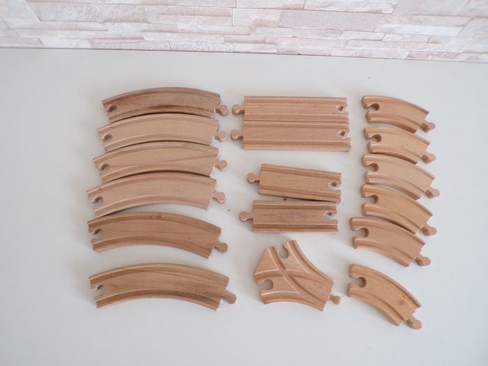 Eléments pour une extension des circuits en bois style Brio pour trains ou voitures en bon état. Le lot comprend 6 virages, 2 droites, 2 petites droites, 6 petits virages, 1 échangeur.