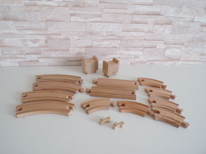 Eléments pour une extension des circuits en bois style Brio pour trains ou voitures en bon état. Le lot comprend 4 virages, 2 droites, 2 pitons mobiles, 6 petits virages, 2 poteaux pour créer un pont. Mon dressing est trié par catégories, tailles et saisons pour les vêtements. #sonia222404 #jouetenfantsonia222404