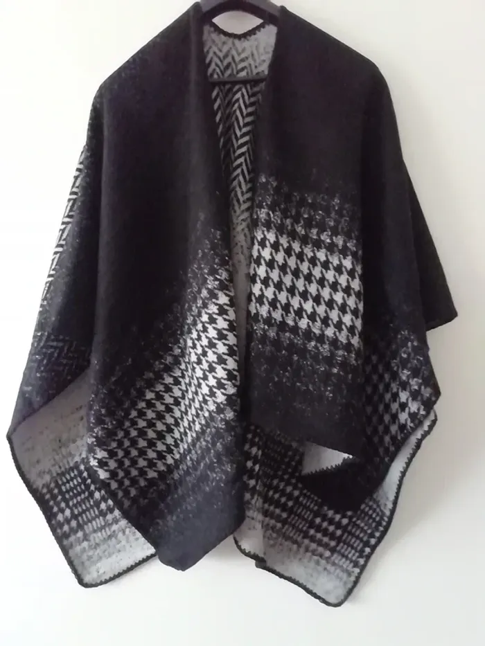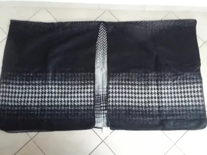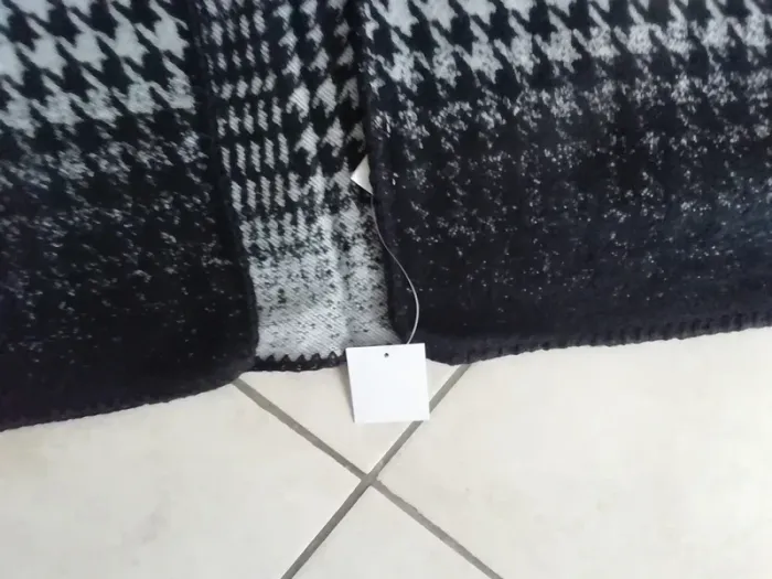DE COULEUR NOIR (et gris). COUPE A POSER SUR LES EPAULES; ENTRE LE CHALE ET LE PONCHO... TAILLE UNIQUE (voir mensurations sur dernière photo). NEUF ENCORE ETIQUETTER DONC IDEAL CADEAU!! hauteur 75. envergure largeur 130.