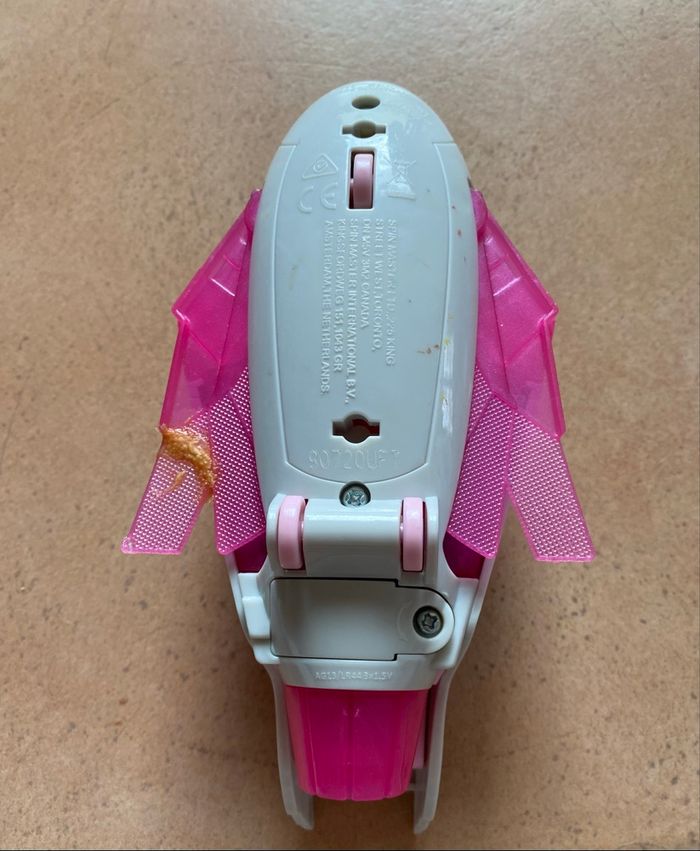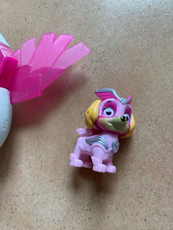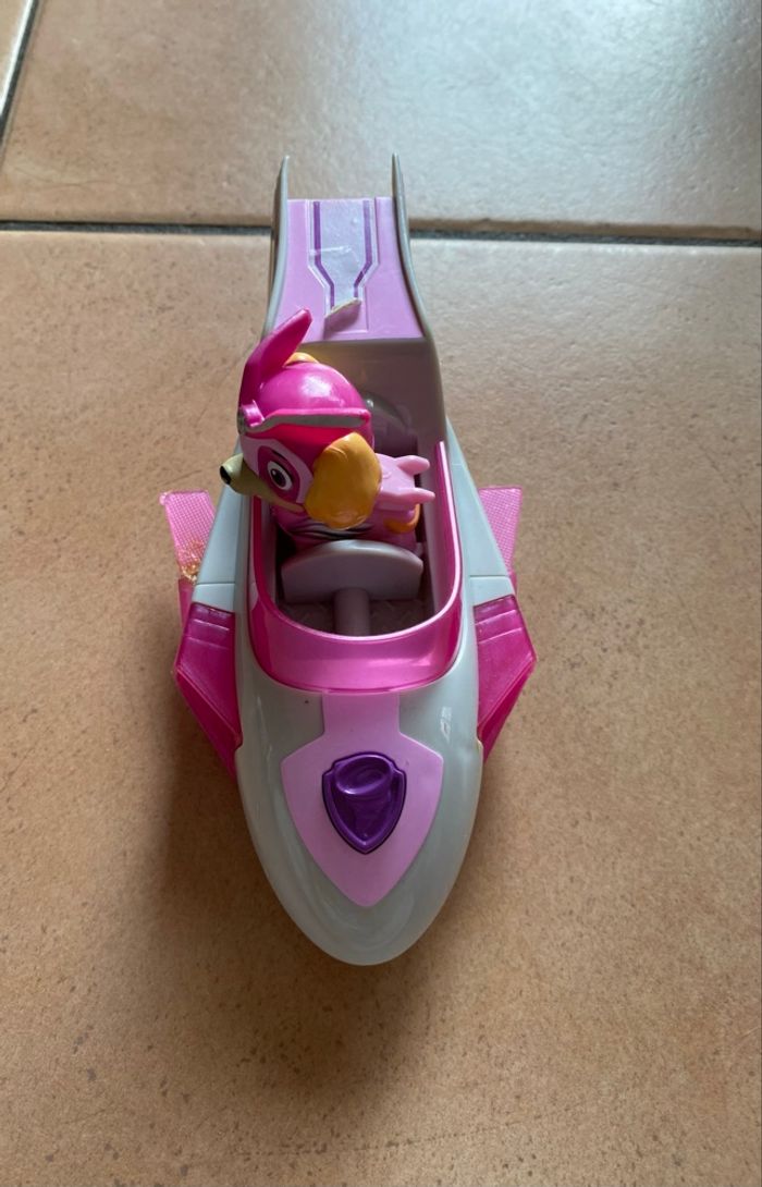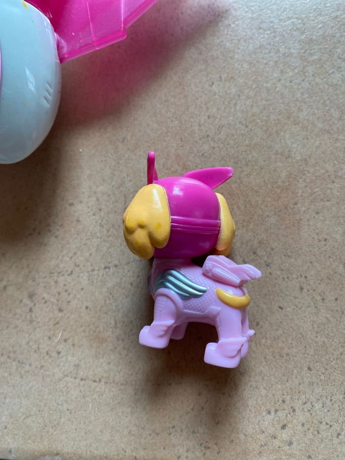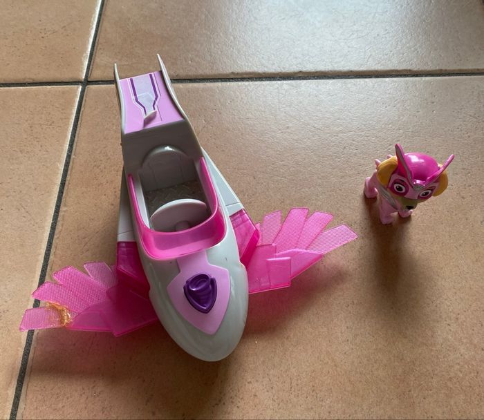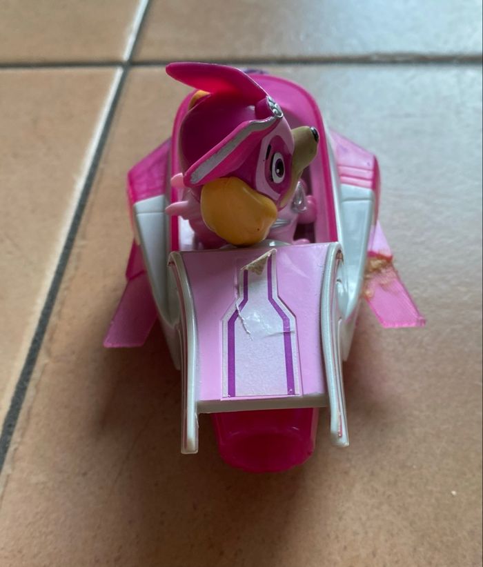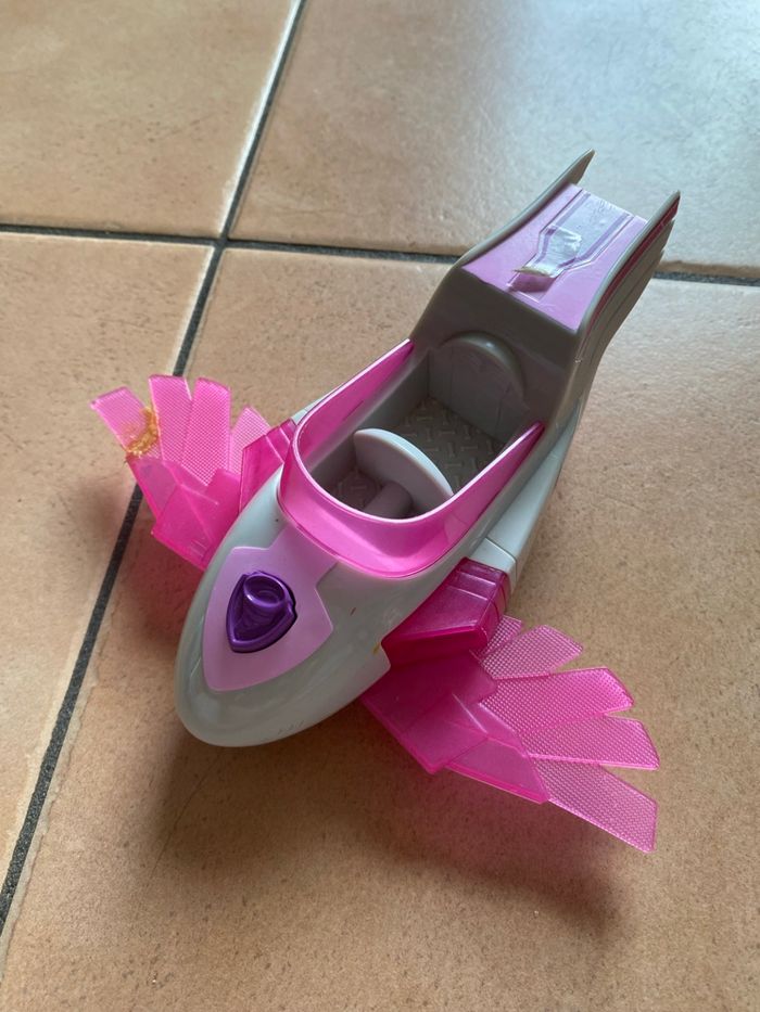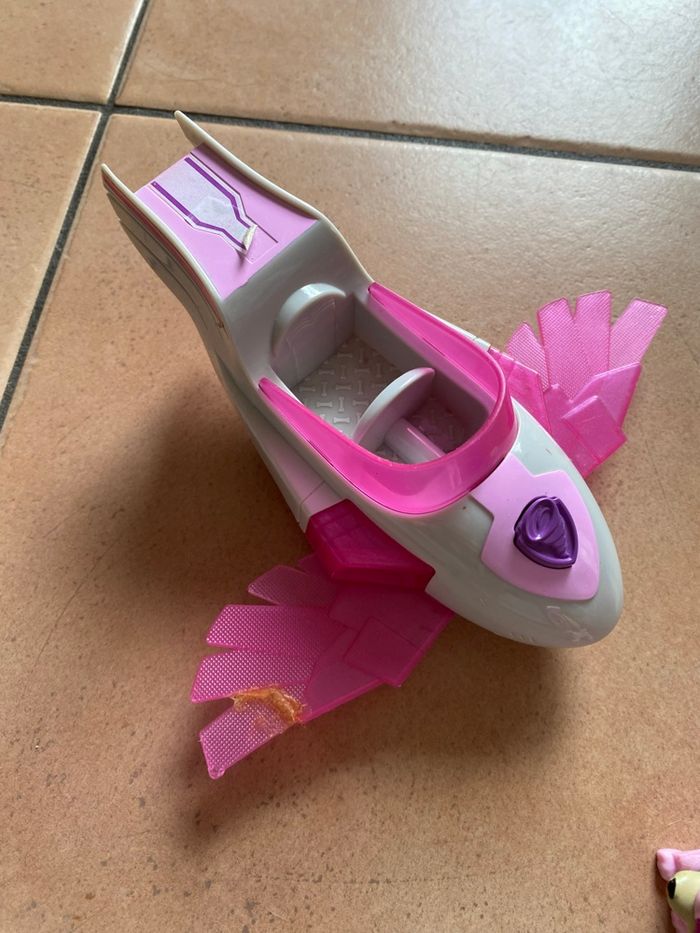 Stella et son véhicule Mighty Pups En bon état général Une des ailes a été recollé (voir photos) S’allume mais les piles sont à changer Vous achetez ce que vous voyez sur les photos